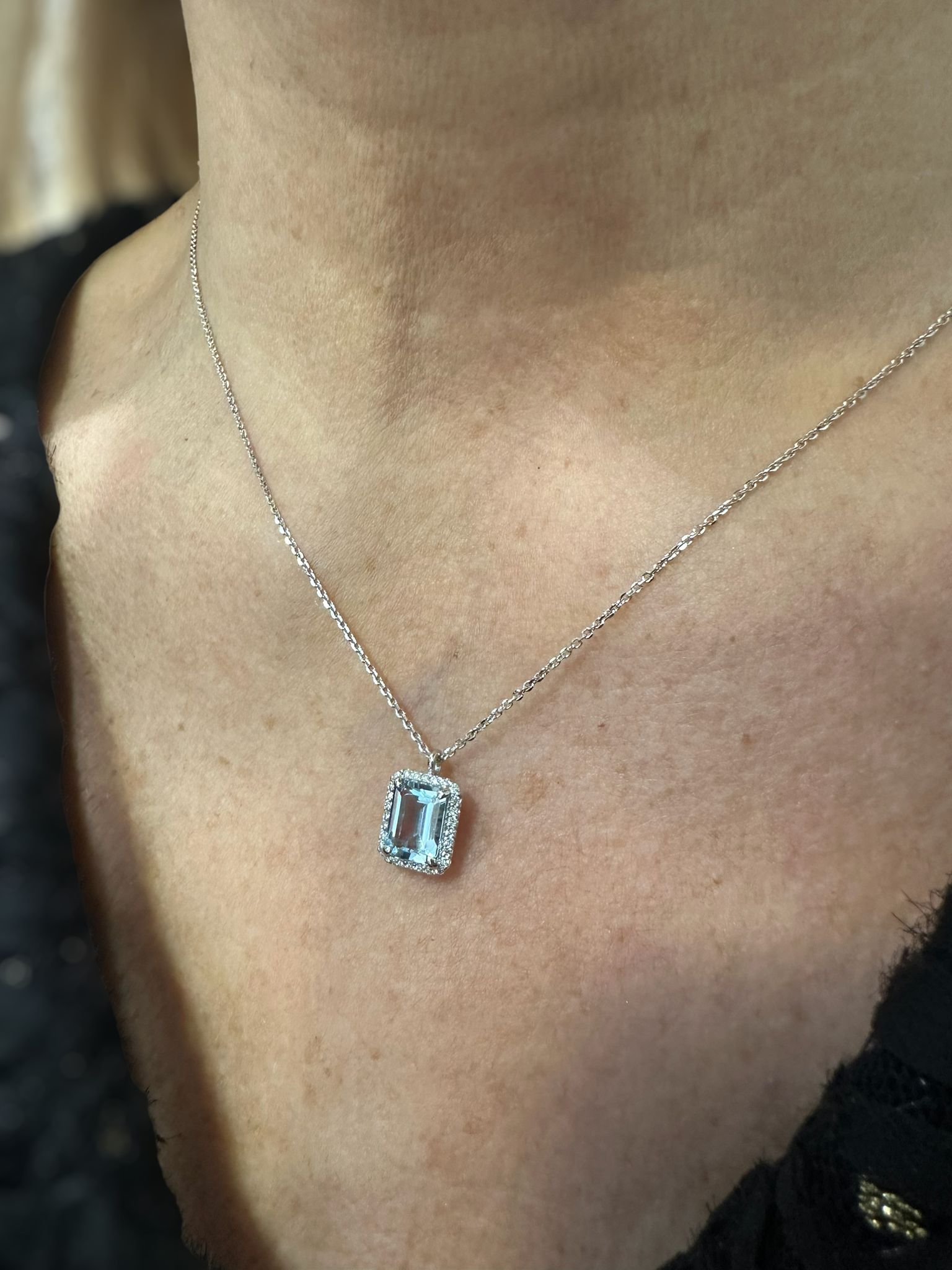 Elegante collana in oro bianco 750% con acquamarina centrale e contorno di diamanti taglio brillante.