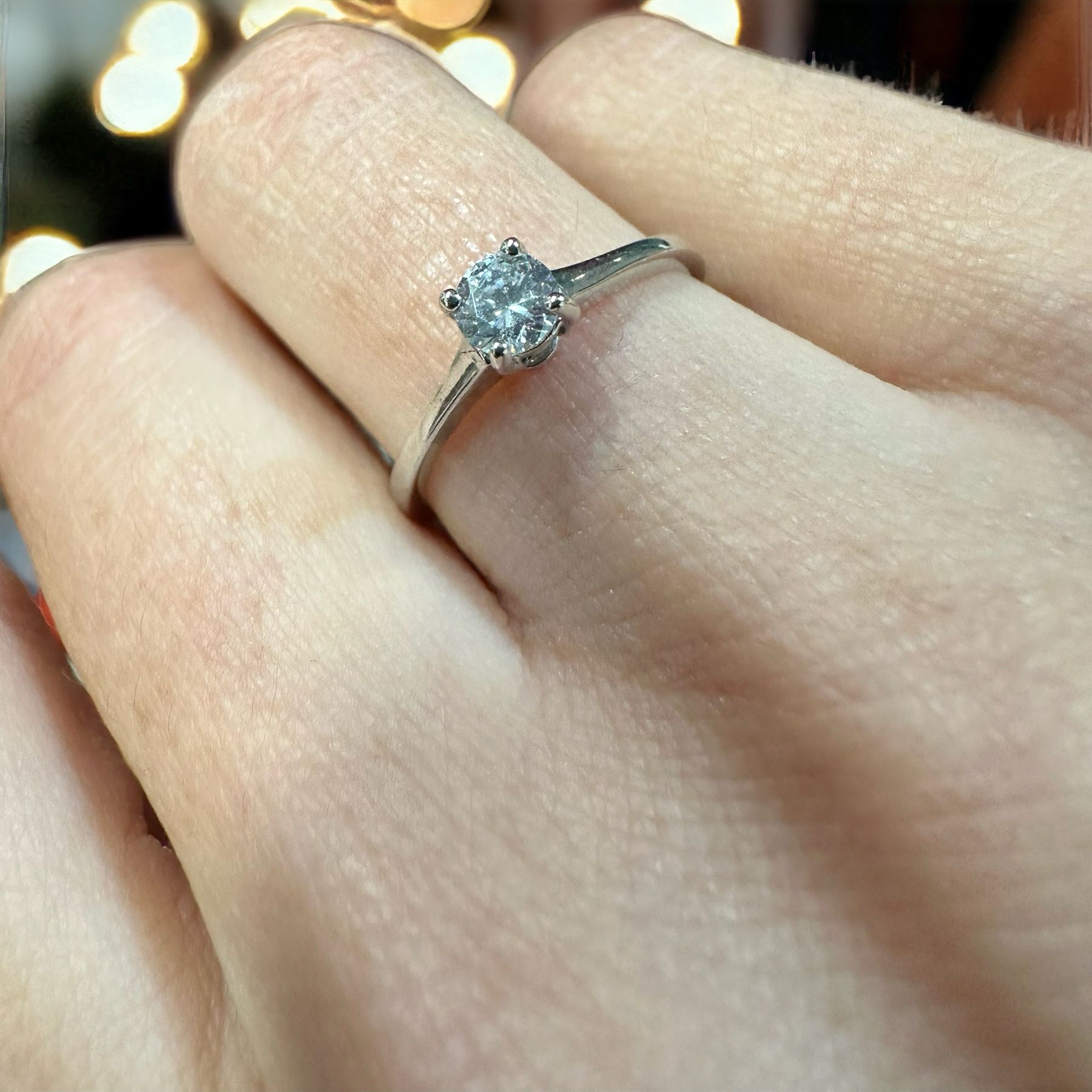 Anello da donna in oro bianco 18kt con zircone bianco centrale su montatura a 4 griffes.