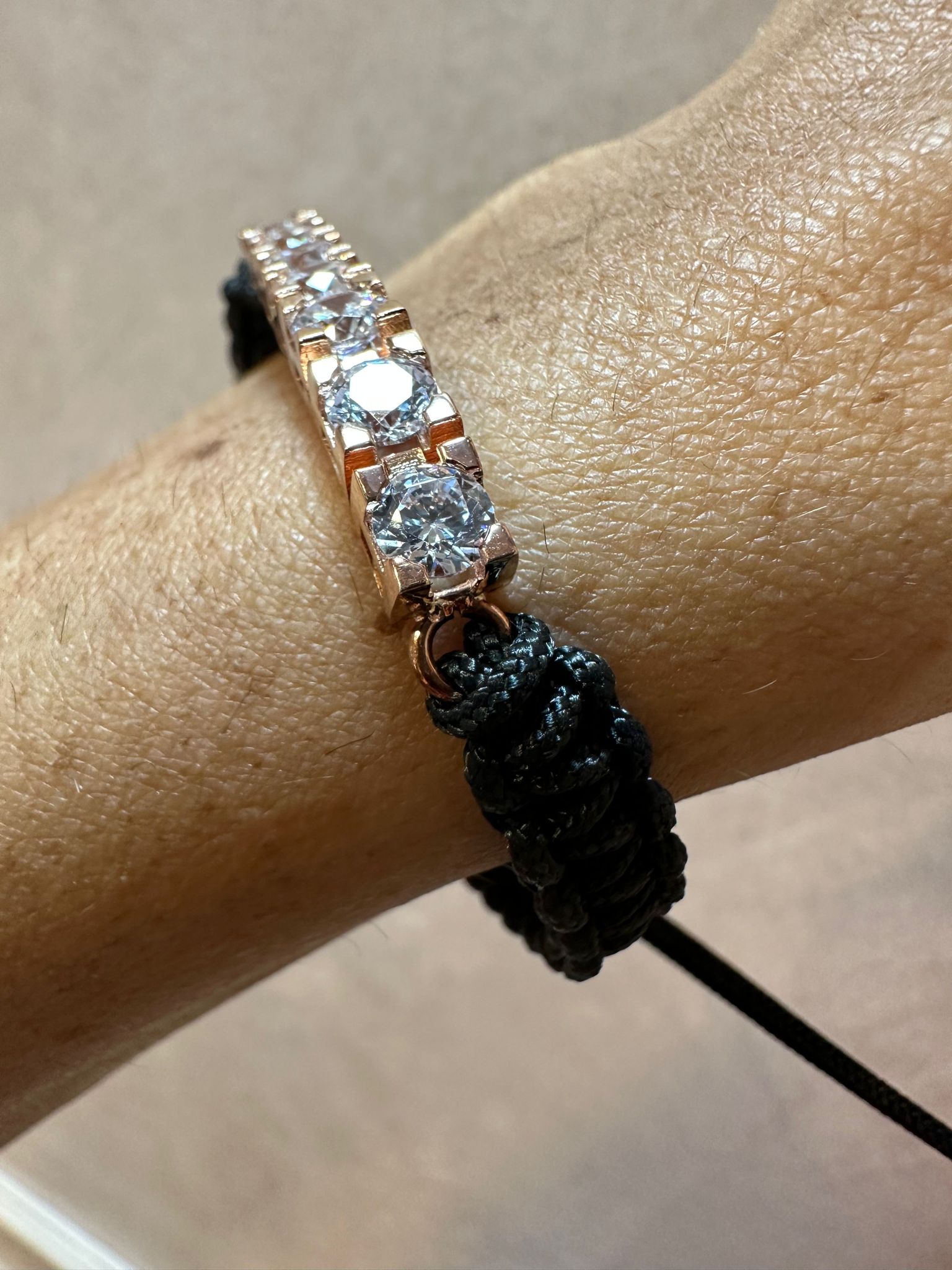 Bracciale unisex con maglia nautica intrecciata color nero, barretta tennis in rose gold placcata oro rosa 18kt e zirconi bianchi.