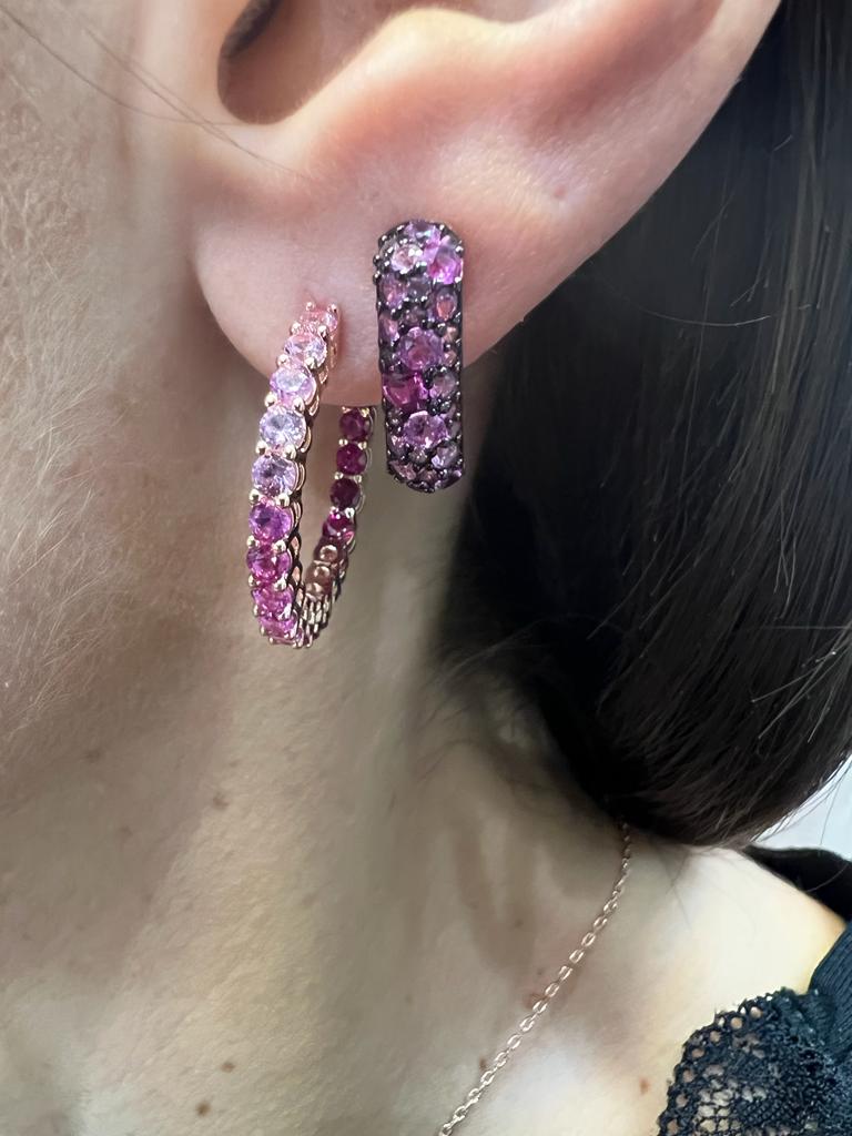Orecchini a cerchio Bronzallure realizzati su base Golden Rosé, placcati oro rosa 18kt, interamente impreziositi da cubic zirconia, dai colori gioiosi e raggianti, con una sfumatura creata attraverso quattro tinte di pietre diverse per creare un effetto degradé; chiusura a perno e farfalla.