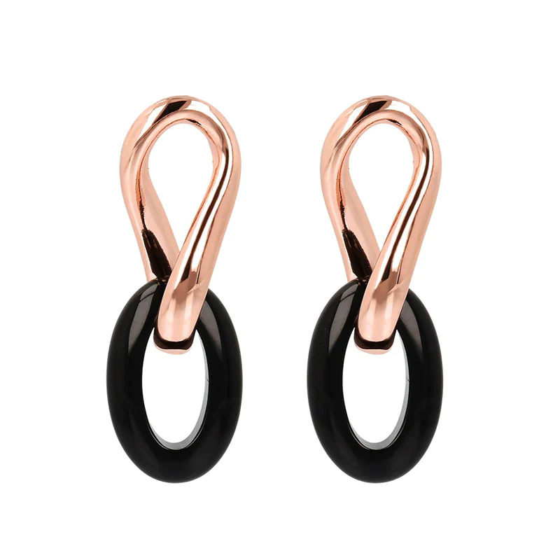 Orecchini in rose gold con placcatura oro rosa 18kt ad intreccio, e onice nero.