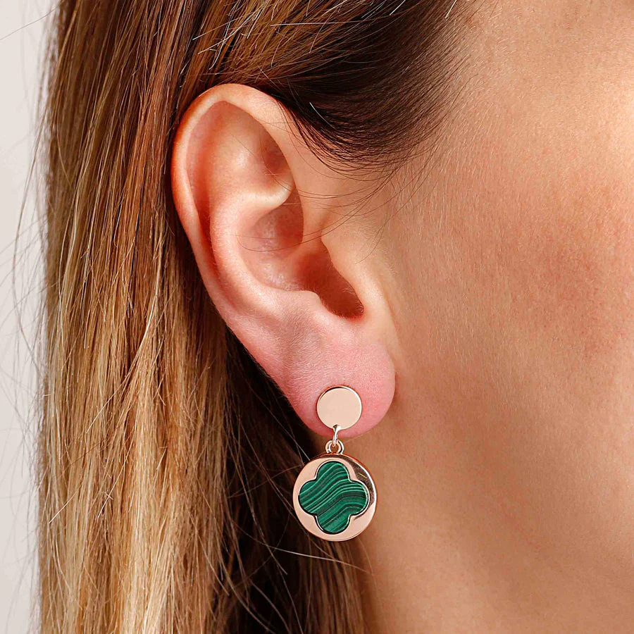 Eleganti orecchini in golden rosè con placcatura in oro rosa 18kt e malachite.