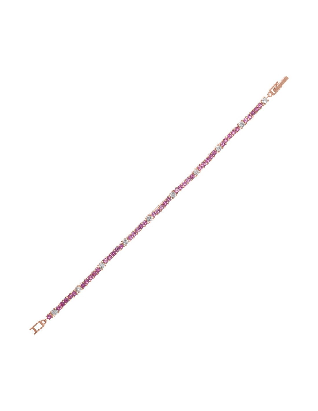Braccialetto tennis da donna realizzato in lega anallergica placcata oro rosa 18 carati e cristalli prisma rosa alternati a zirconi bianchi.