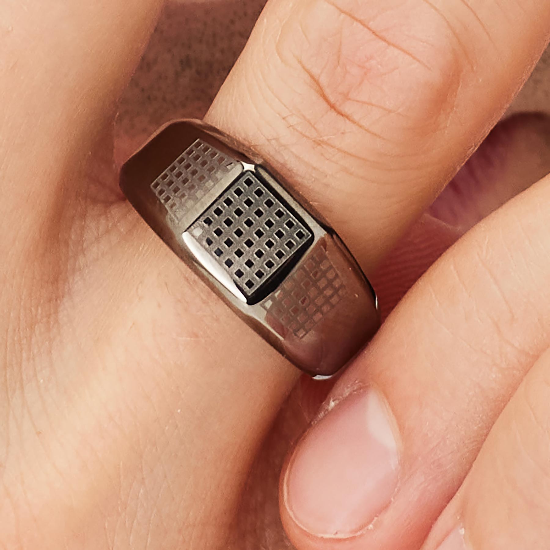 Anello sigillo in acciaio 316L lucido e sabbiato con finitura pvd colore rutenio.