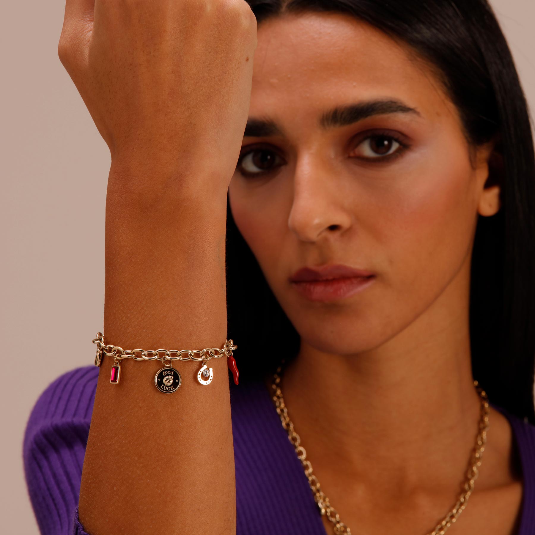 Bracciale catena rolò in acciaio 316L, finitura color oro con pendenti a forma di coccinella con incisione, cornetto in smalto rosso, ferro di cavallo e gufo, cristalli crystal e siam.