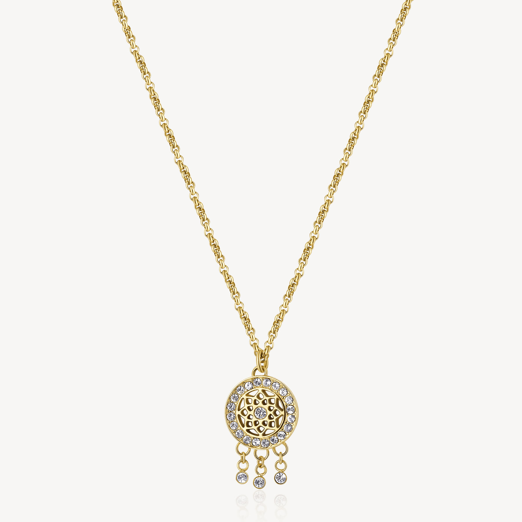 Collana girocollo in acciaio 316L, con finitura colo oro, pendente a forma di acchiappasogni e cristalli crystal.