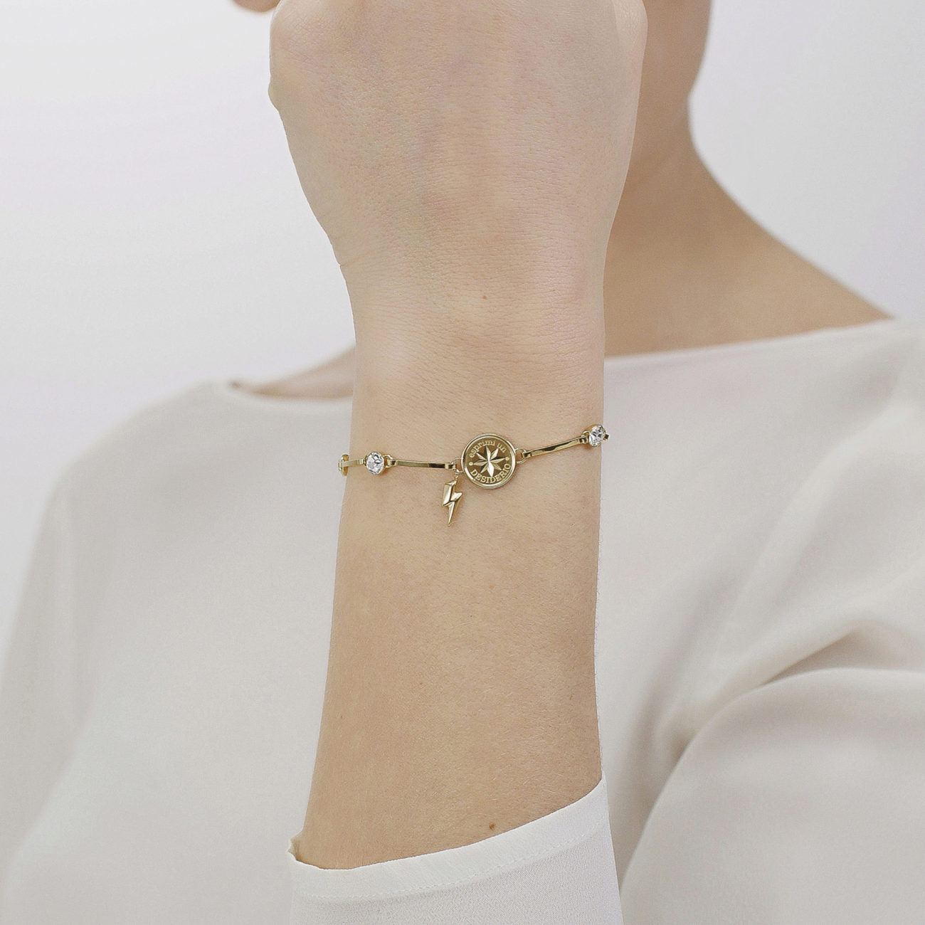 Bracciale in acciaio 316L e finitura oro con rosa dei venti e pendente a forma di saetta e cristalli crystal.