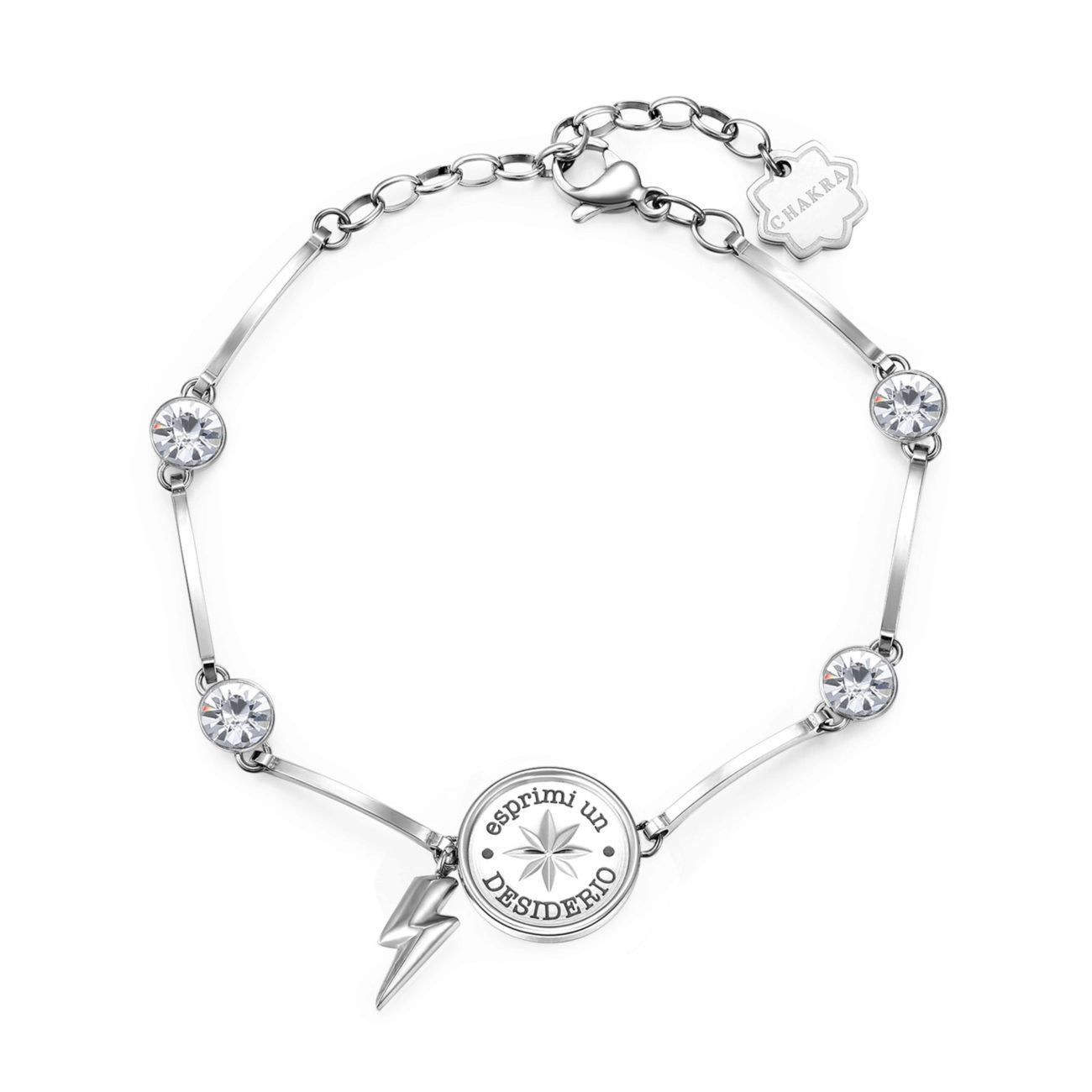Bracciale in acciaio 316L con rosa dei venti e pendente a forma di saetta e cristalli crystal.