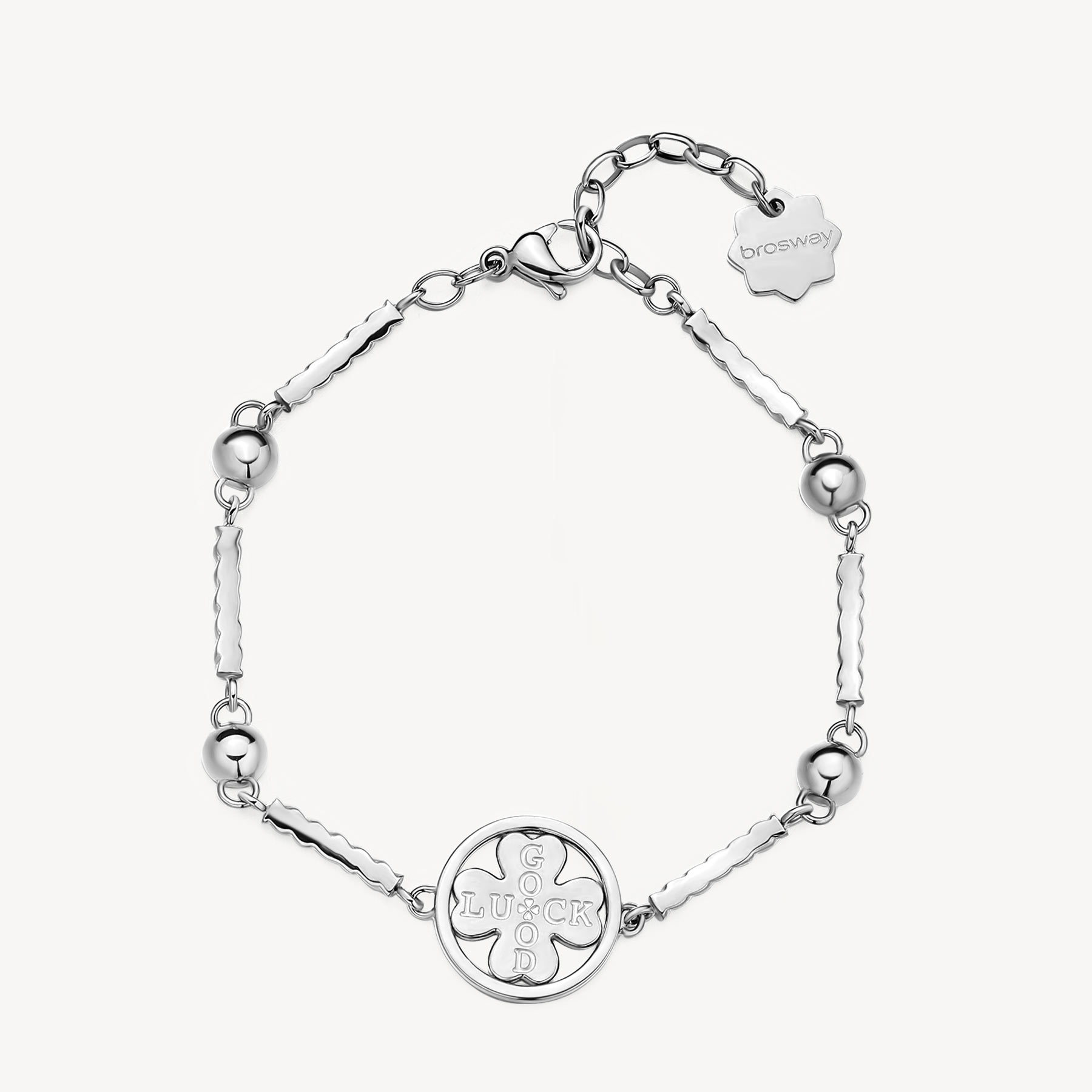 Bracciale semirigido in acciaio 316L con centrale a forma di quadrifoglio con madreperla verde e cristalli.