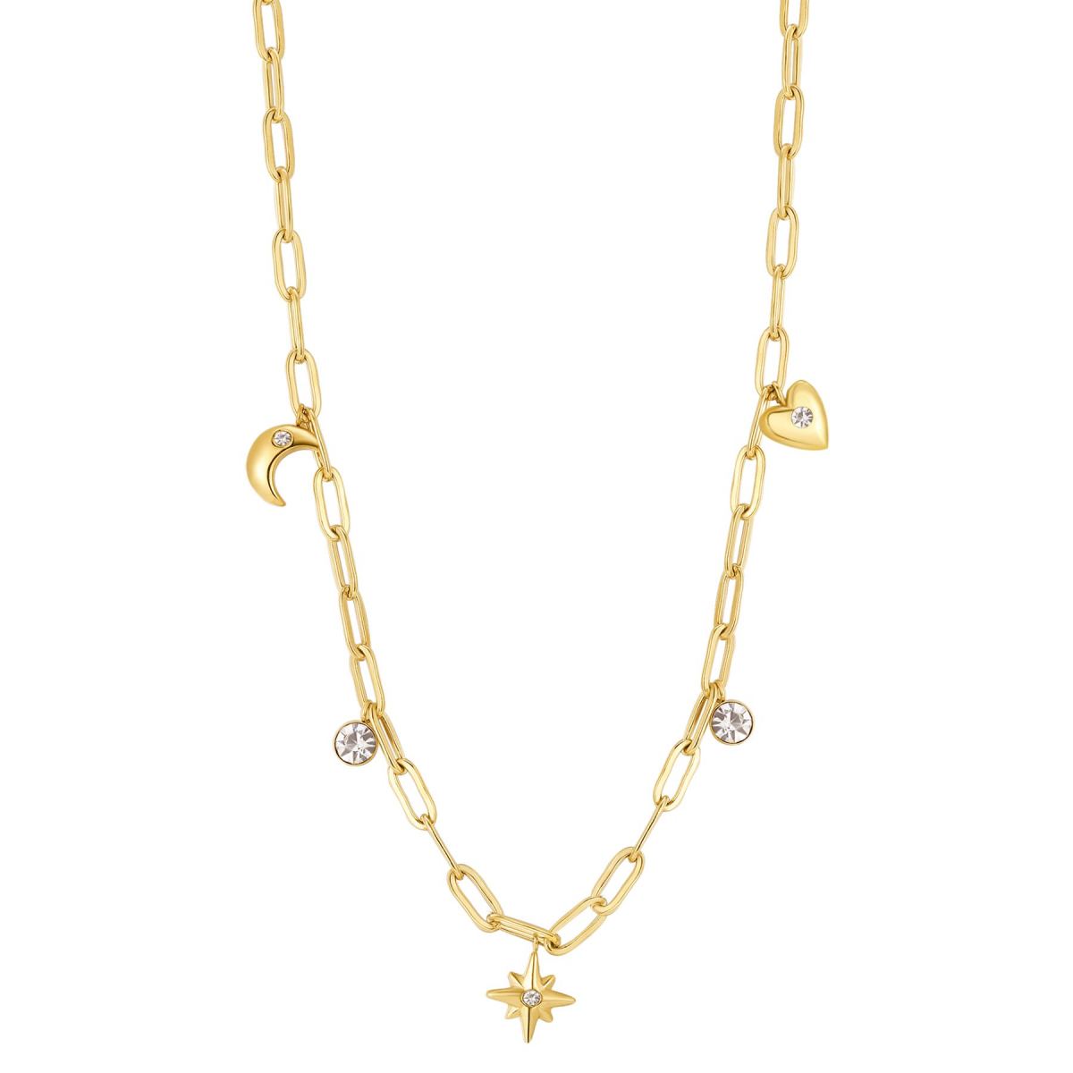 Collana catena rettangolare in acciaio 316L e finitura color oro con ciondoli a forma di luna, stella, cuore e cristalli crystal.