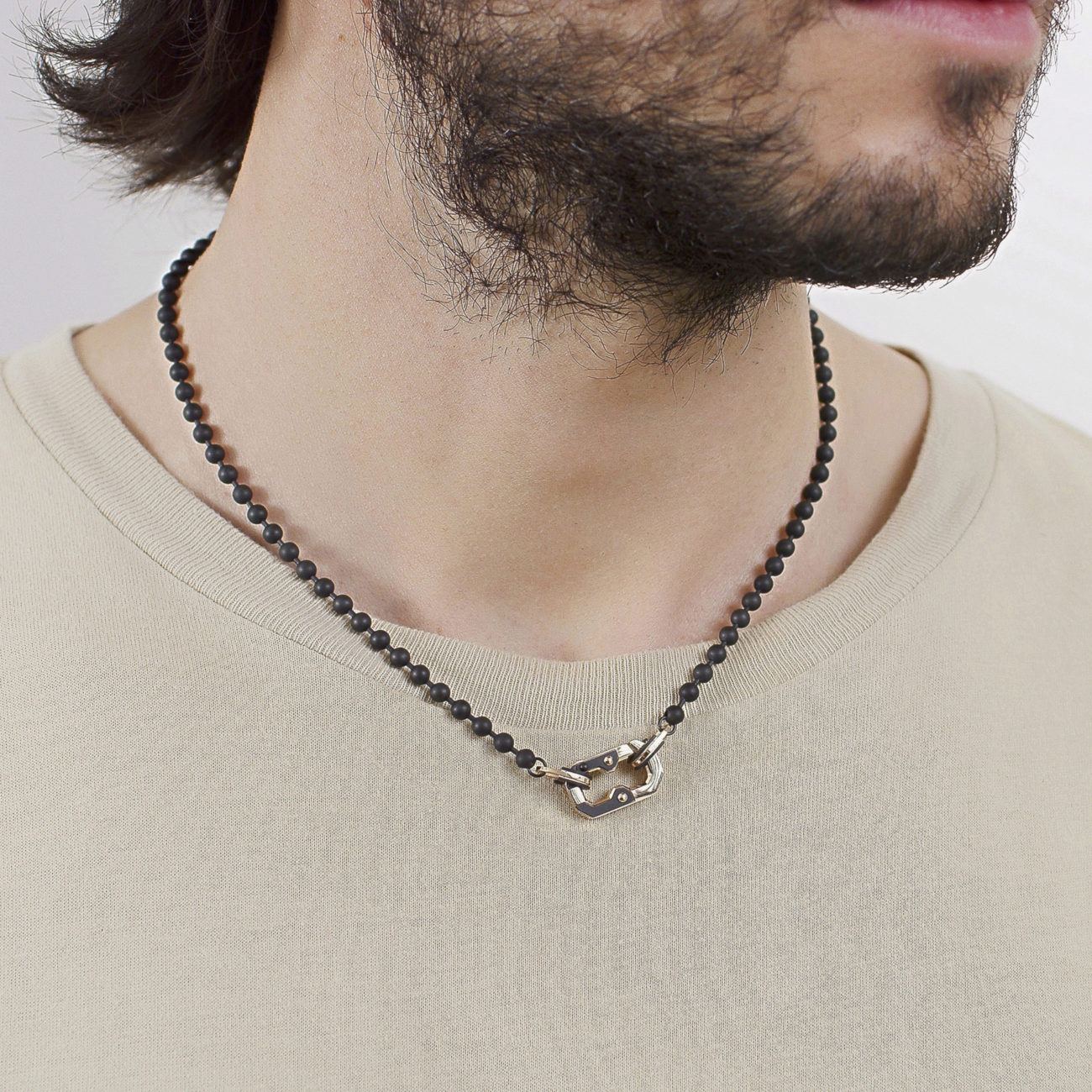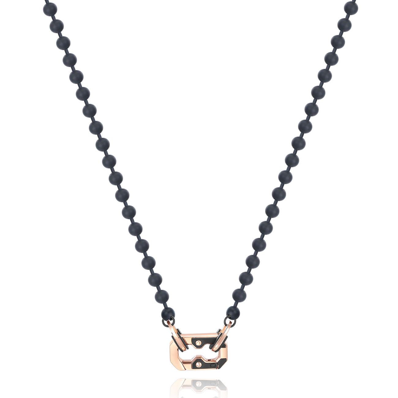 Collana con sfere in acciaio 316L, finitura nera e moschettone con finitura oro rosa.