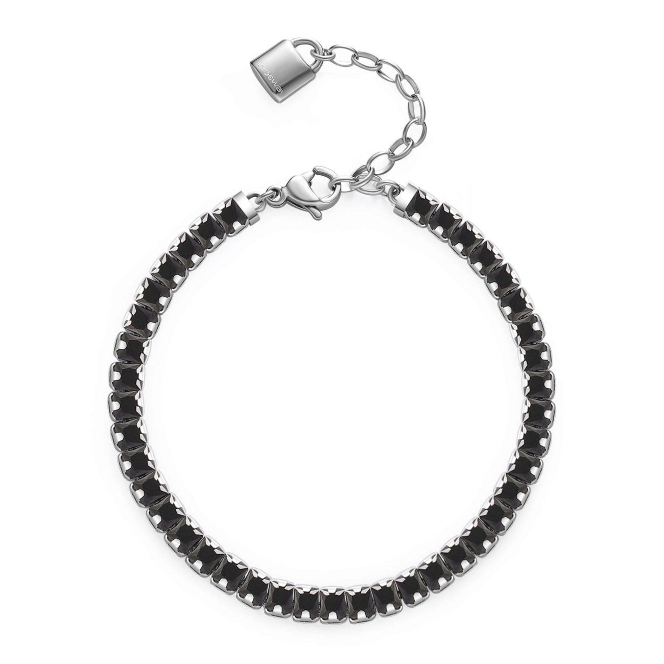 Bracciale tennis in acciaio 304 con cubic zirconia quadrati black e pendente chiusura a forma di lucchetto.