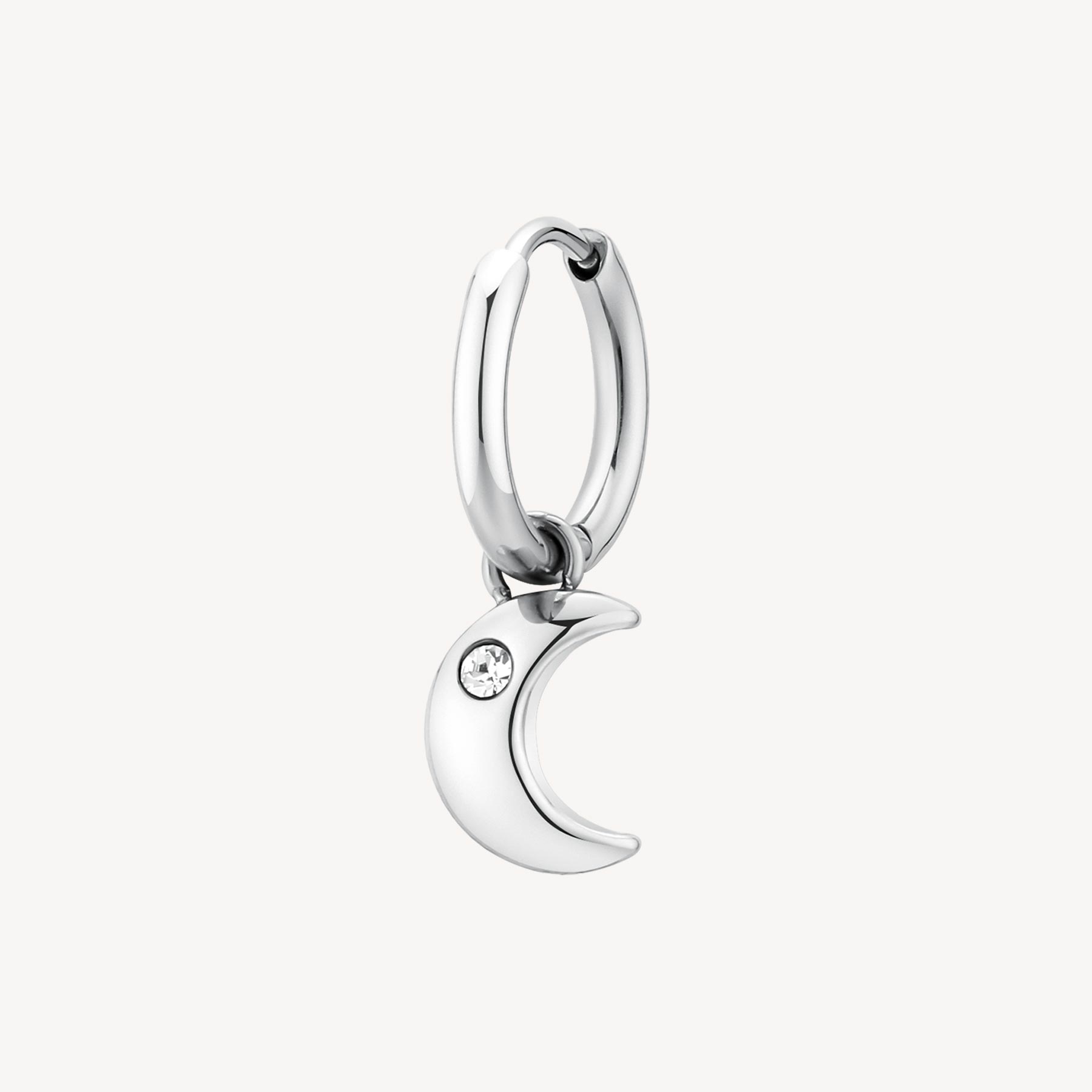 Orecchino singolo a cerchio in acciaio 316L con pendente a forma di luna e cristallo crystal.