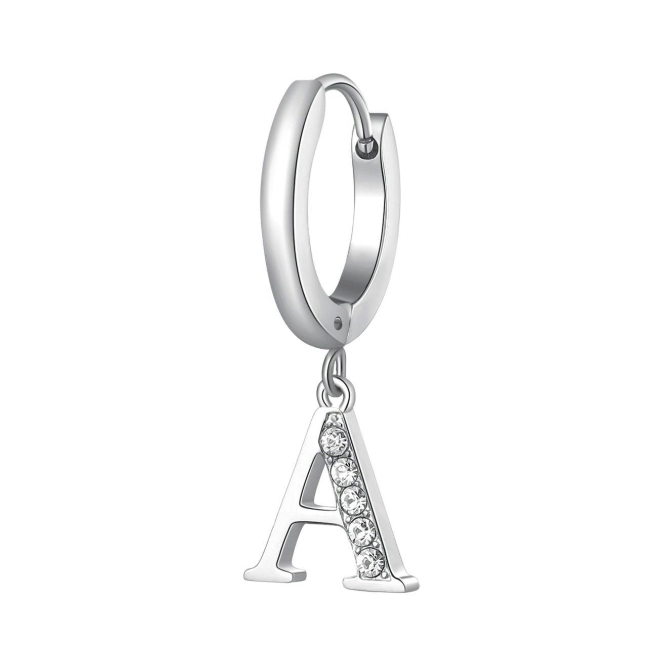 Orecchino singolo in acciaio 316L con pendente a forma di lettera A e cristalli crystal.