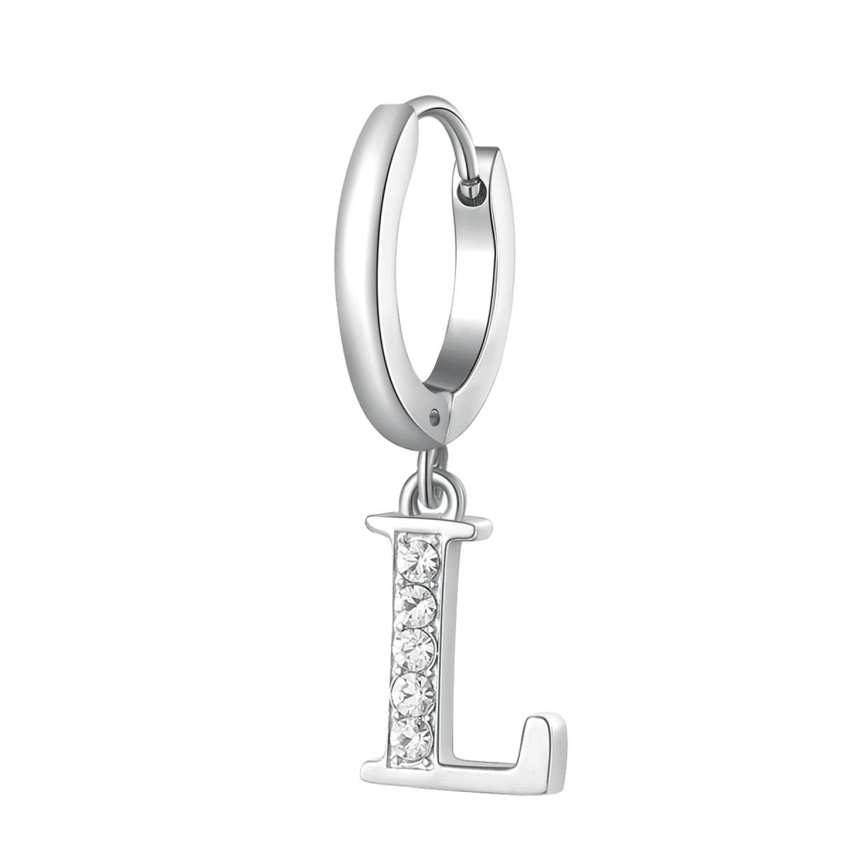 Orecchino singolo in acciaio 316L con pendente a forma di lettera L e cristalli crystal.