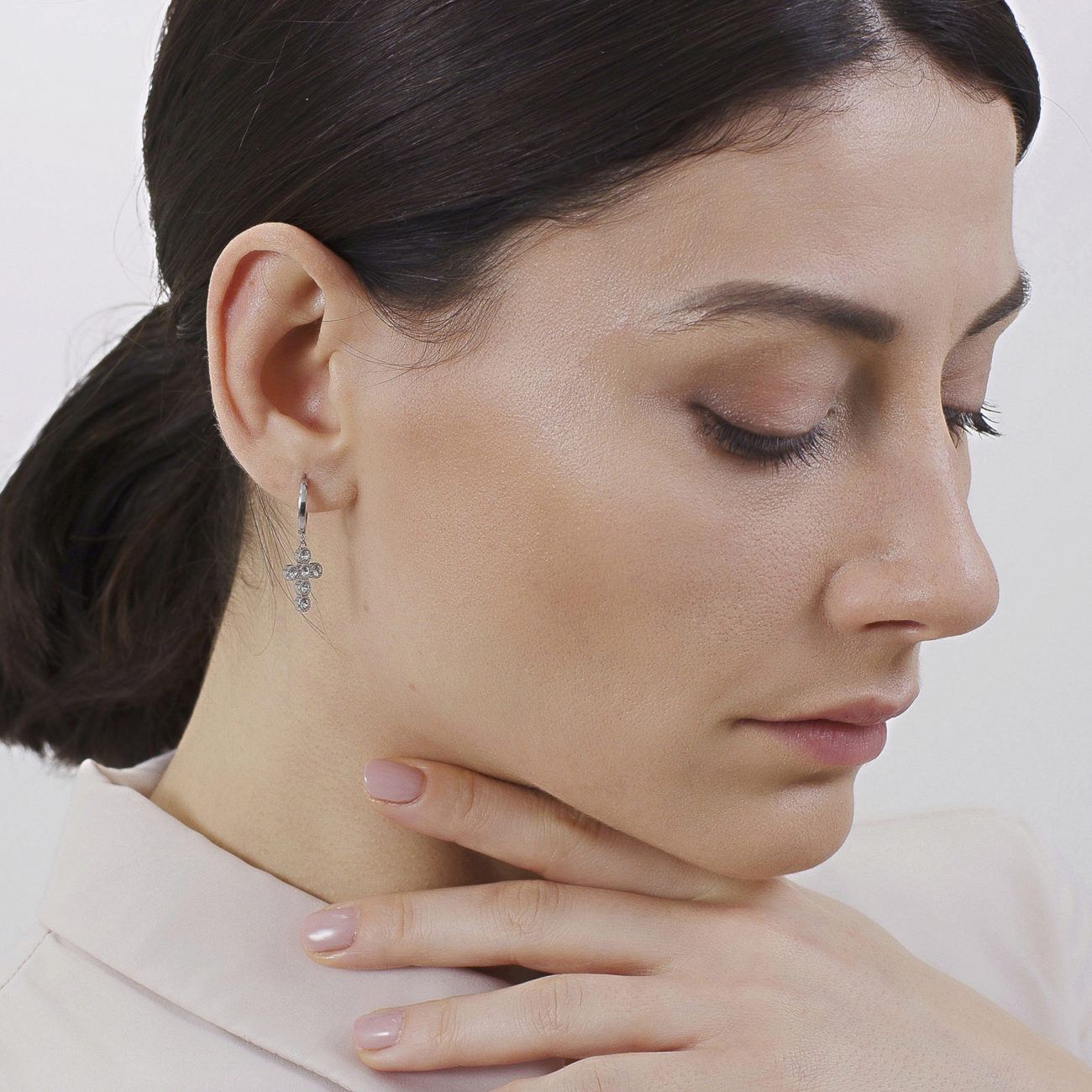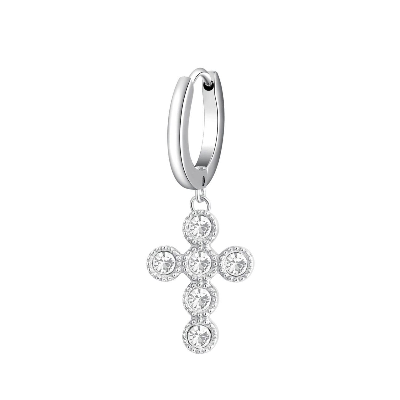 Orecchino singolo in acciaio 316L con pendente a forma di croce e cristalli.