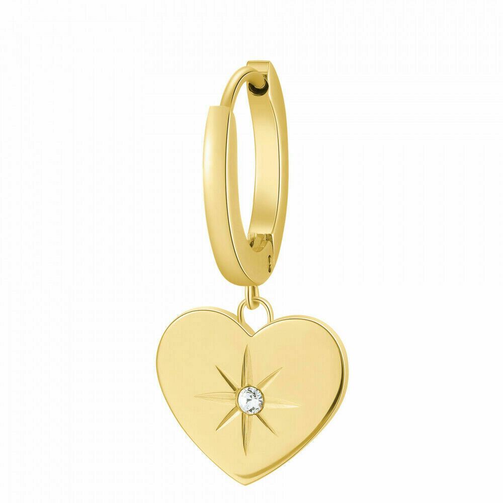 Orecchino singolo in acciaio 316L e finitura oro con pendente a forma di cuore e cristallo.