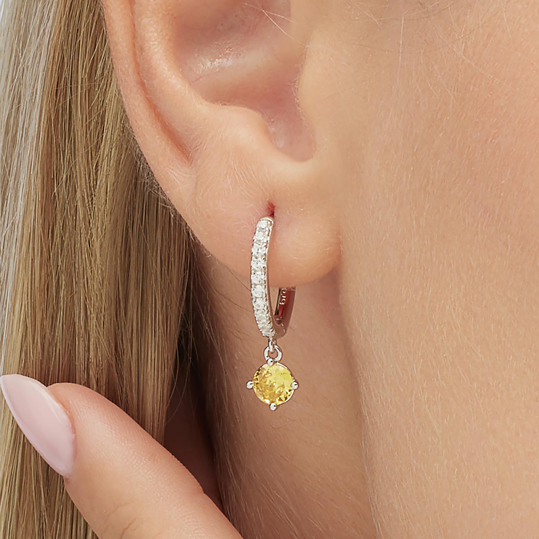 Orecchino singolo a cerchietto in argento rodiato 925‰ con cubic zirconia chiari e pendente con round cubic zirconia colore golden yellow.