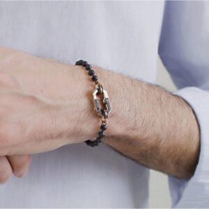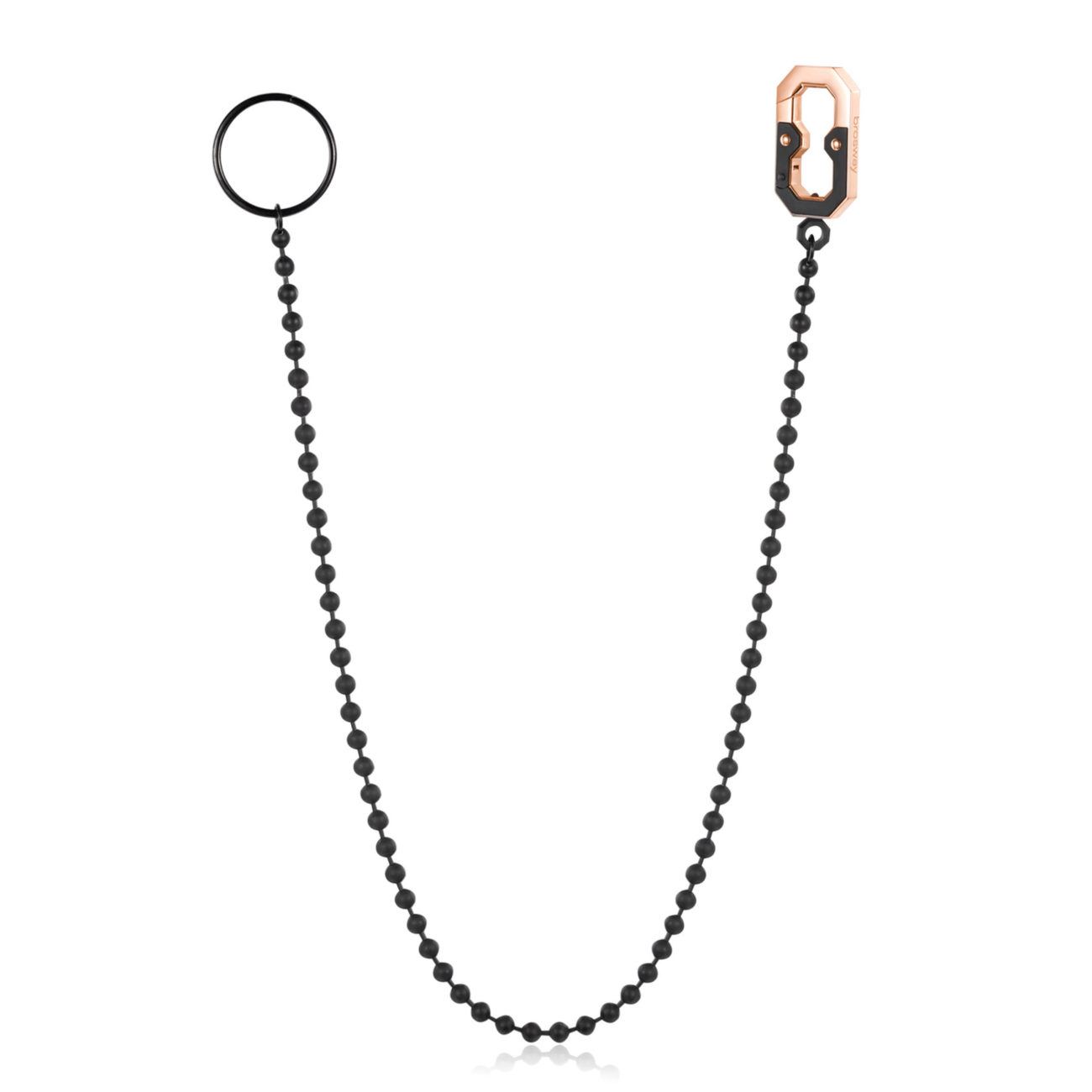 Portachiavi catena con sfere in acciaio 316L, finitura nera e moschettone con finitura oro rosa.