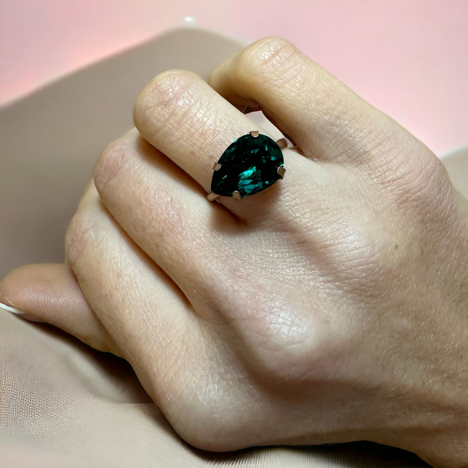 Anello da donna in argento 925 rosè regolabile, con quarzo idrotermale a goccia verde.