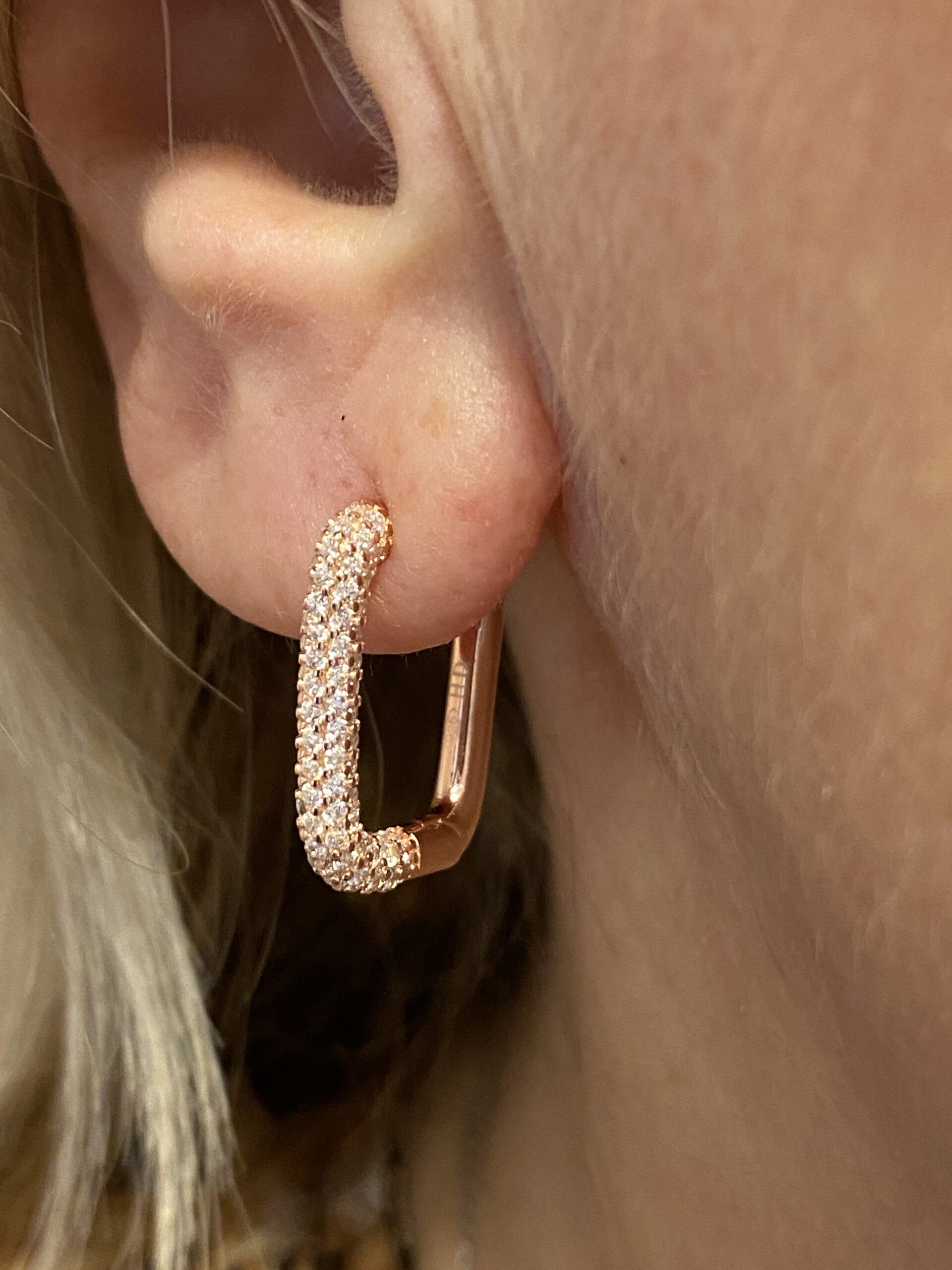 Eleganti orecchini in argento 925 con pvd rosè a cerchi squadrati con zirconi bianchi.
