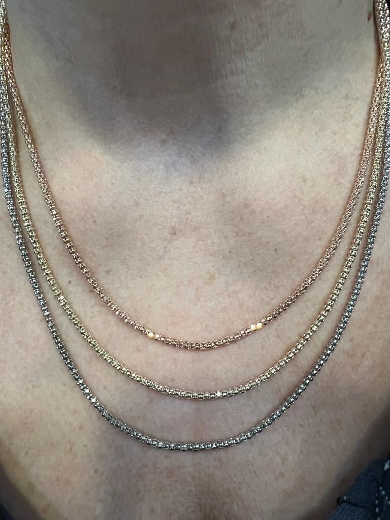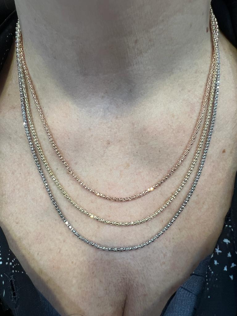 Elegante collana multifilo in argento 925 rodiato, placcato oro rosa e oro giallo.