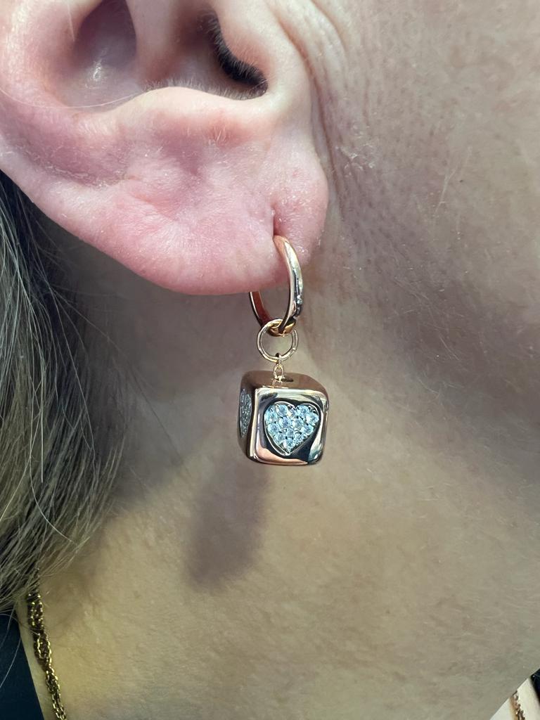 Orecchini in argento 925 con placcatura oro rosa e pendente a forma di dado con zirconi bianchi.