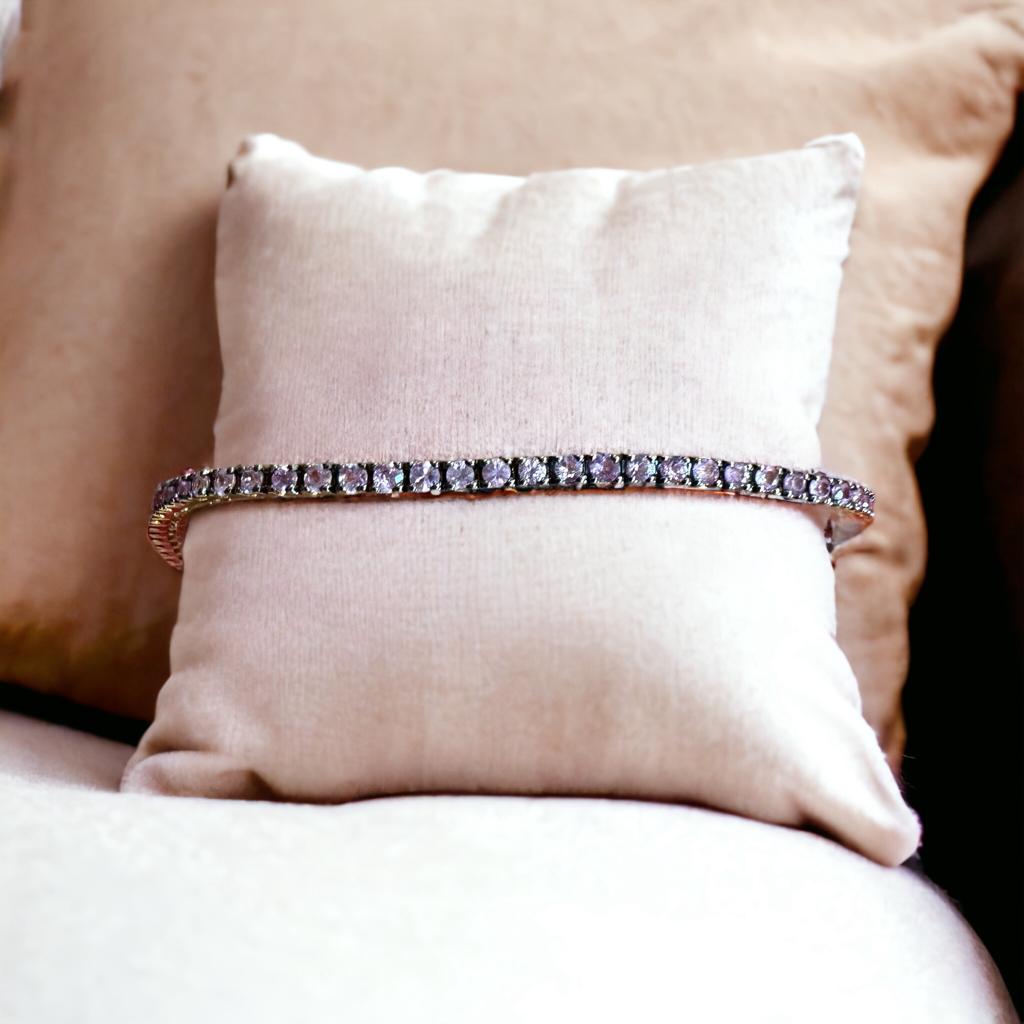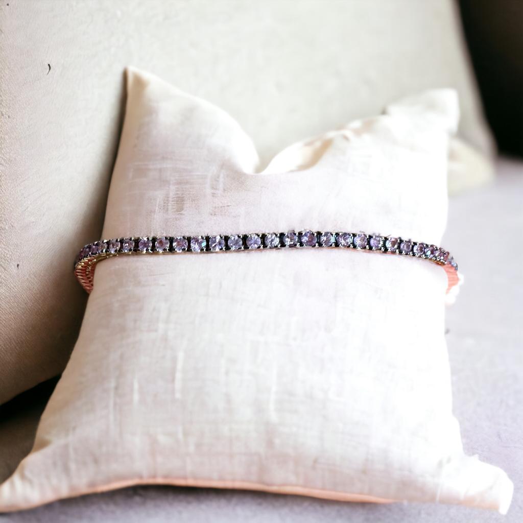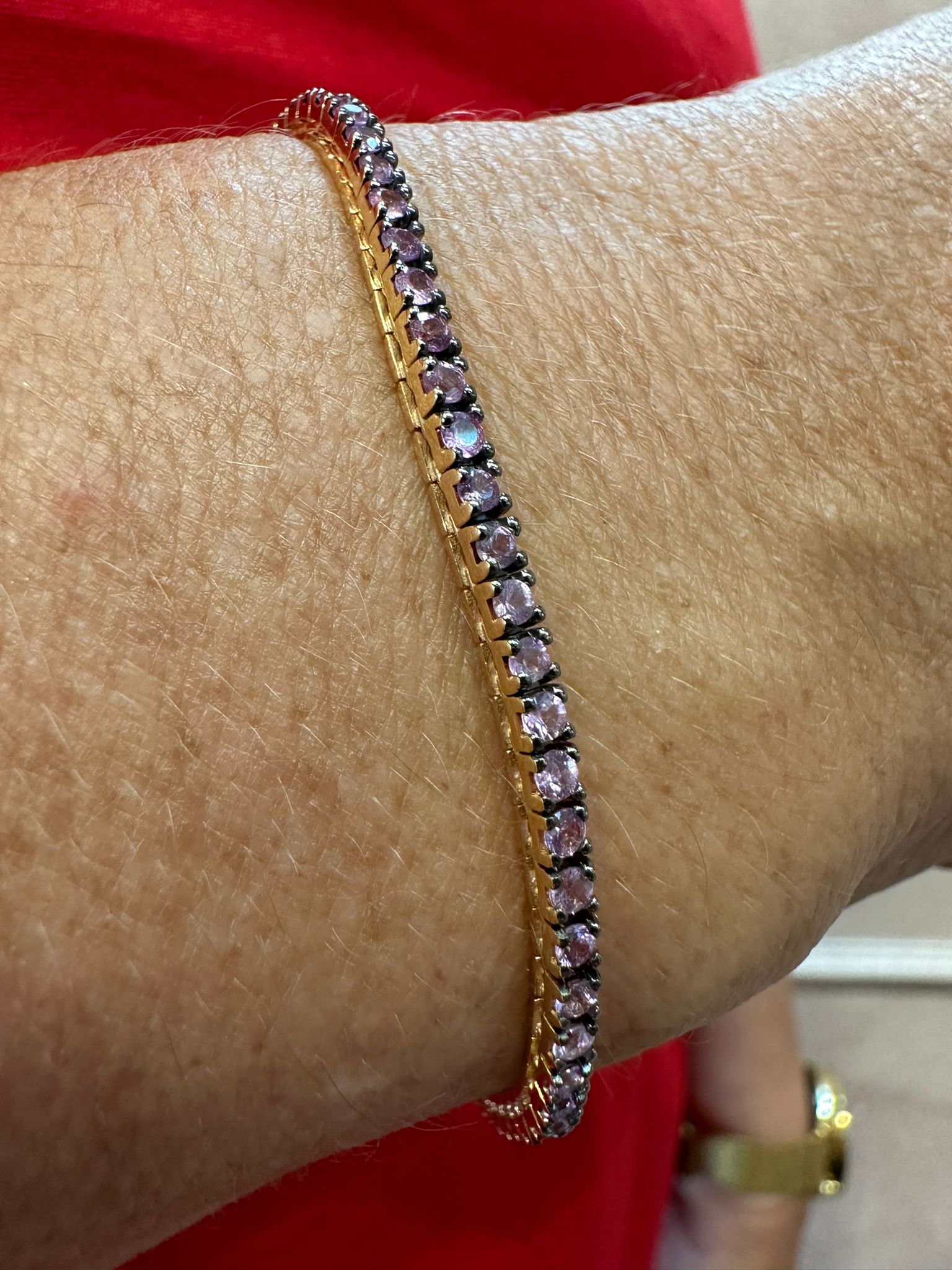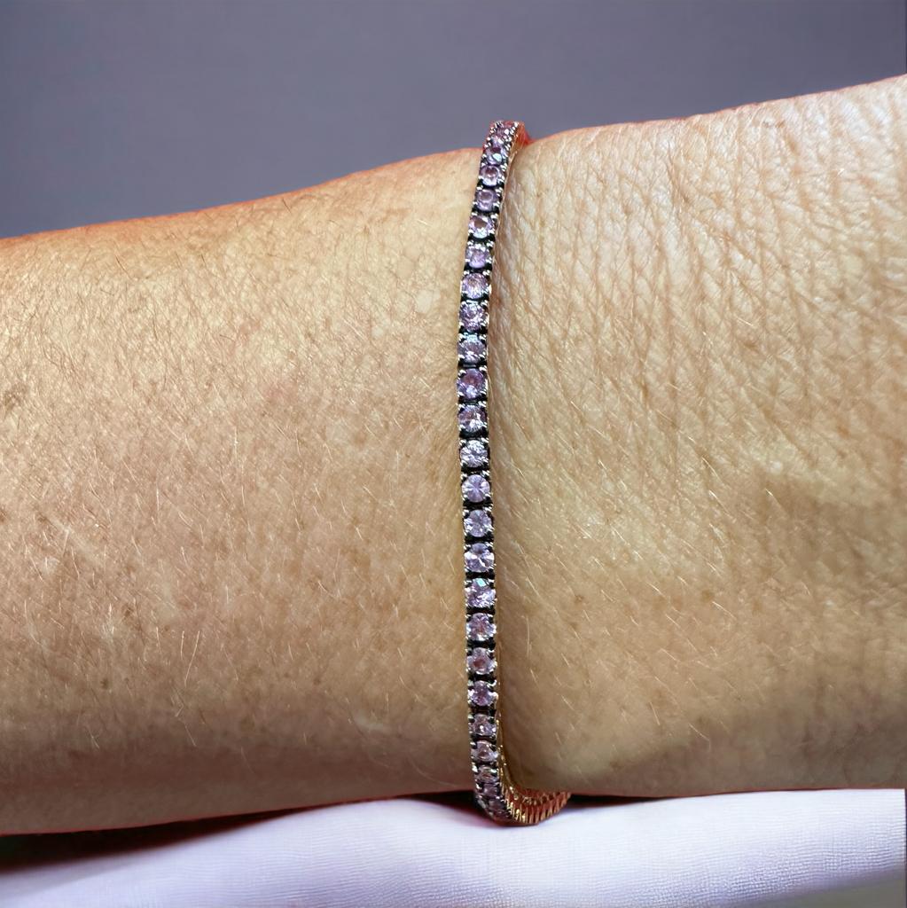 Elegante bracciale tennis in oro rosa 18kt con zaffiri rosa e rifinitura in oro bianco 18kt nella chiusura a doppio otto di sicurezza.