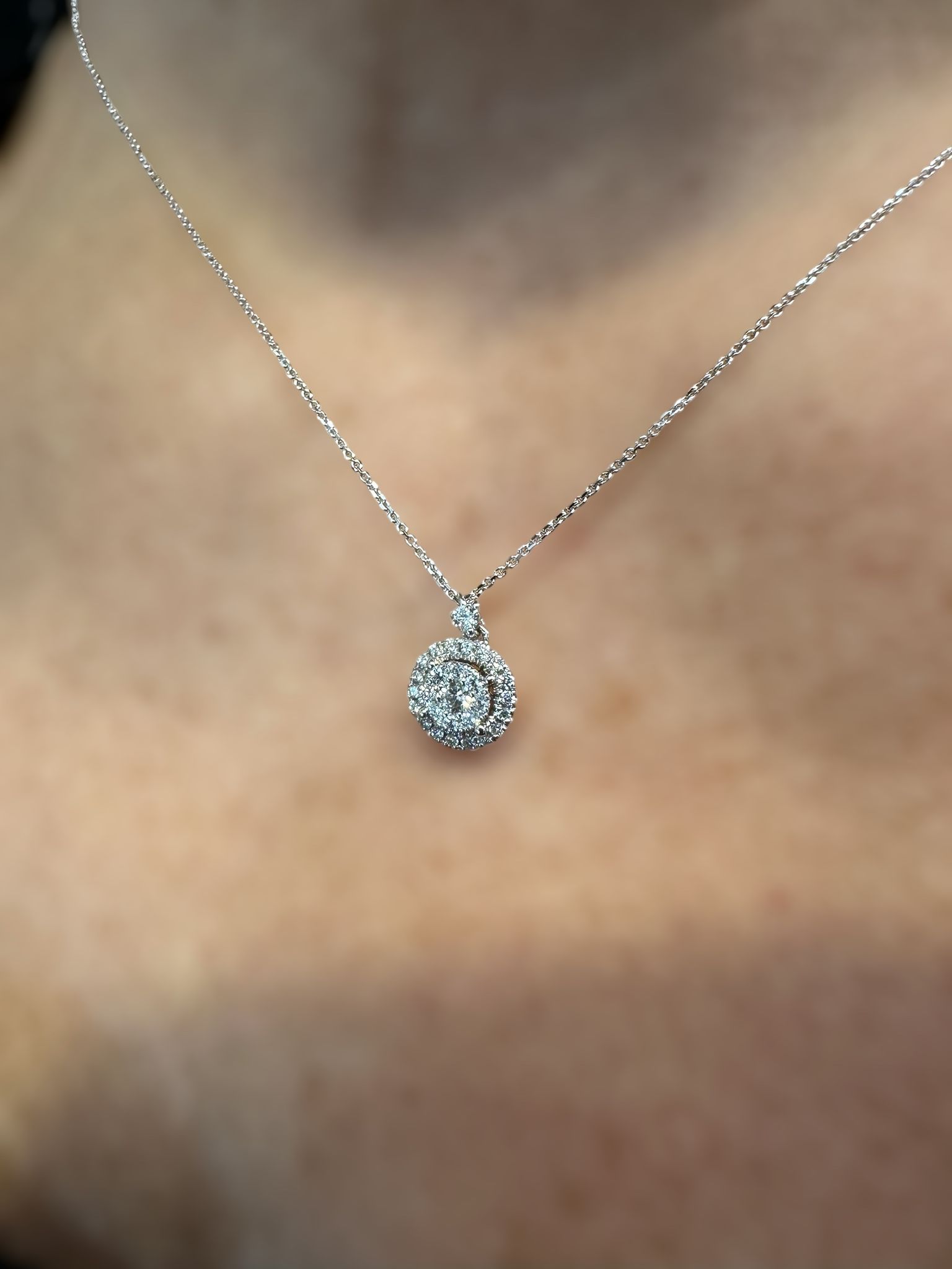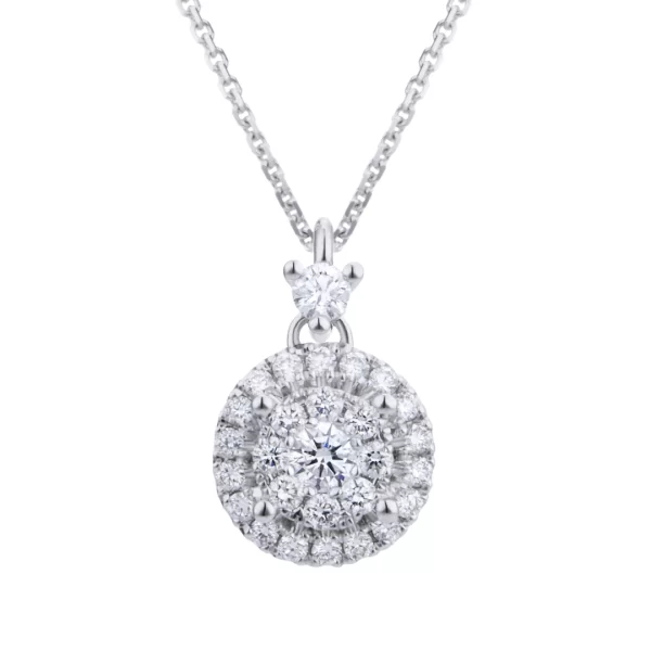 Elegante collier in oro bianco 750% con ciondolo impreziosito da pavè di brillanti.