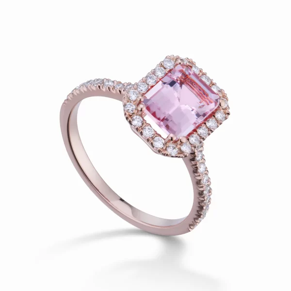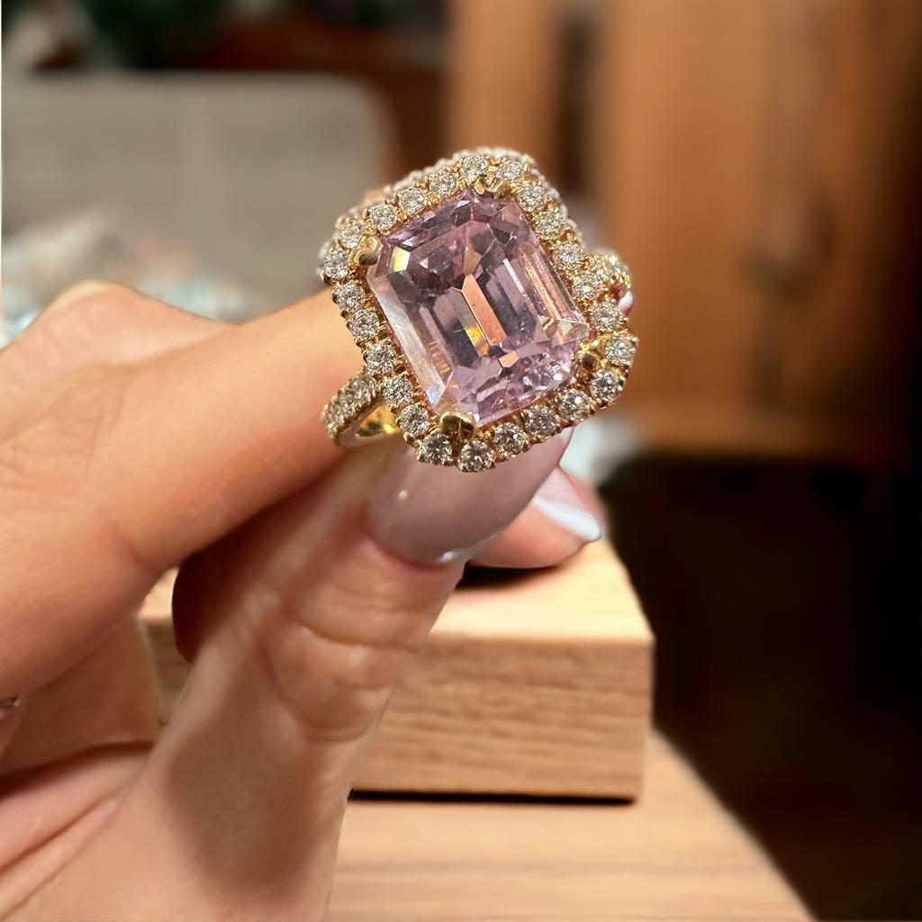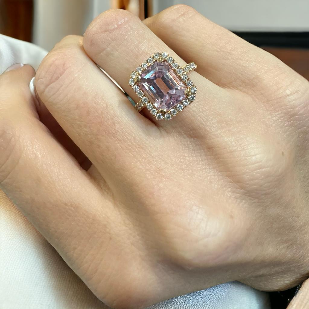 Stupendo anello in oro rosa 750% con kunzite ottagonale e diamanti taglio brillante.