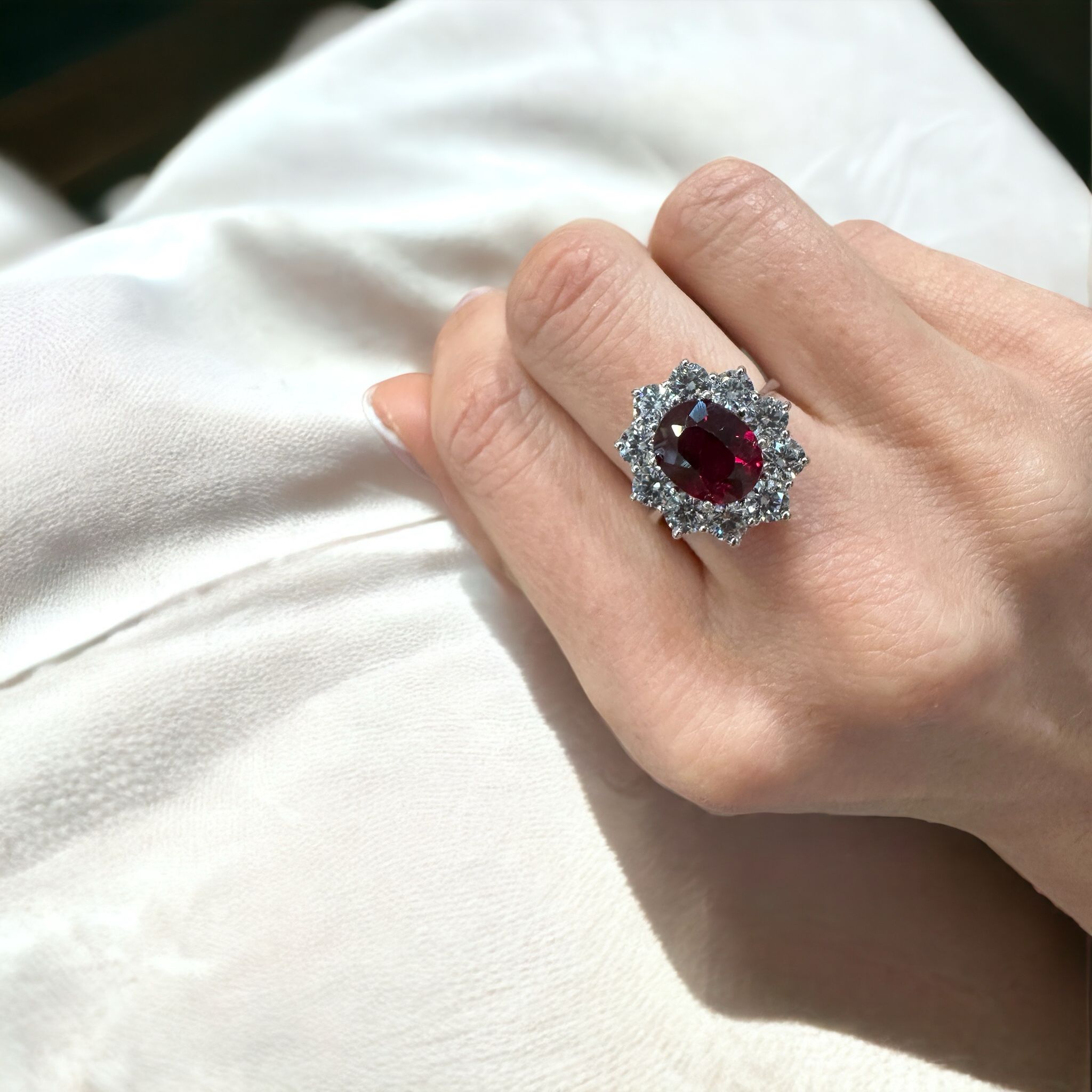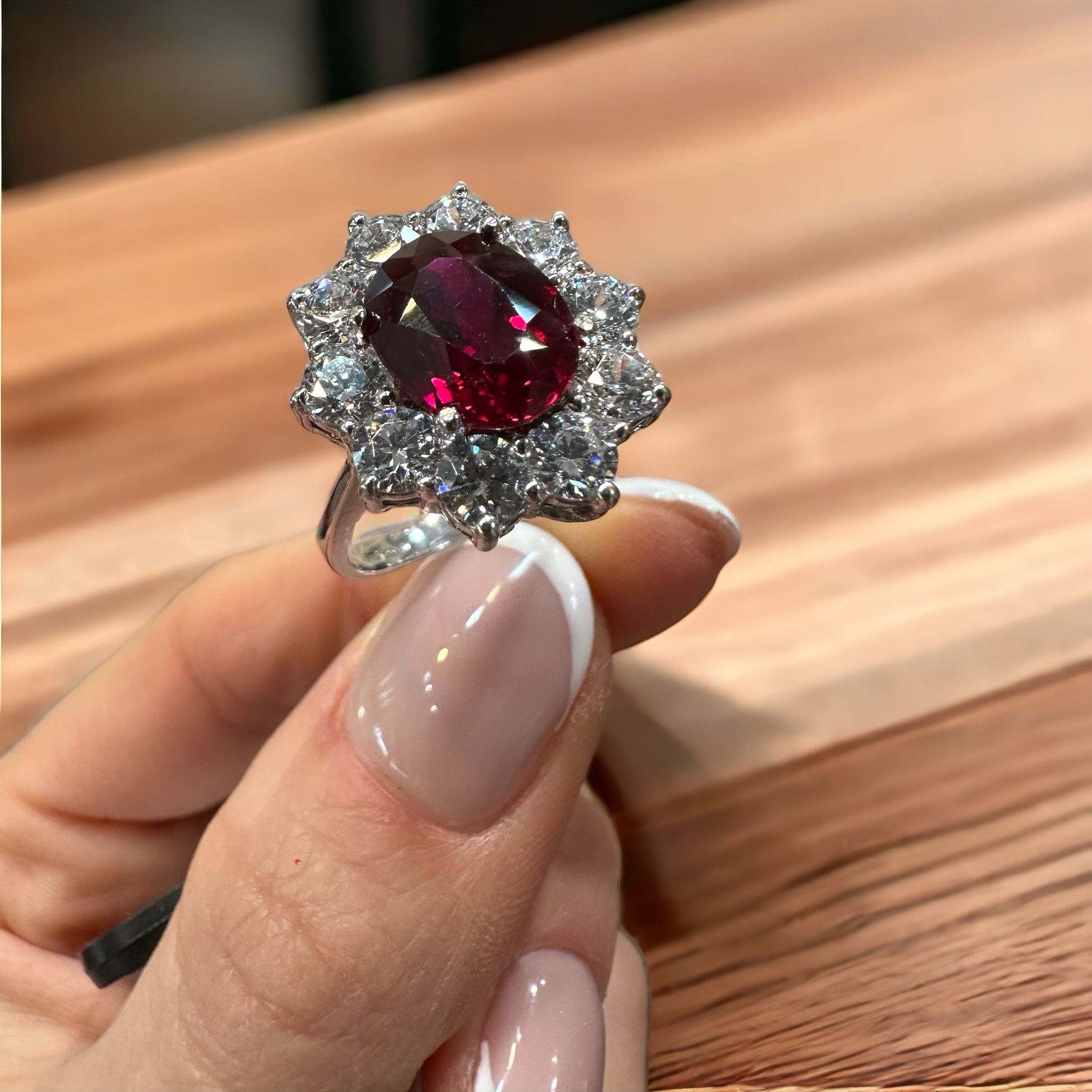 Anello royal in argento 925 con zircone rosso e contorno di zirconi bianchi.