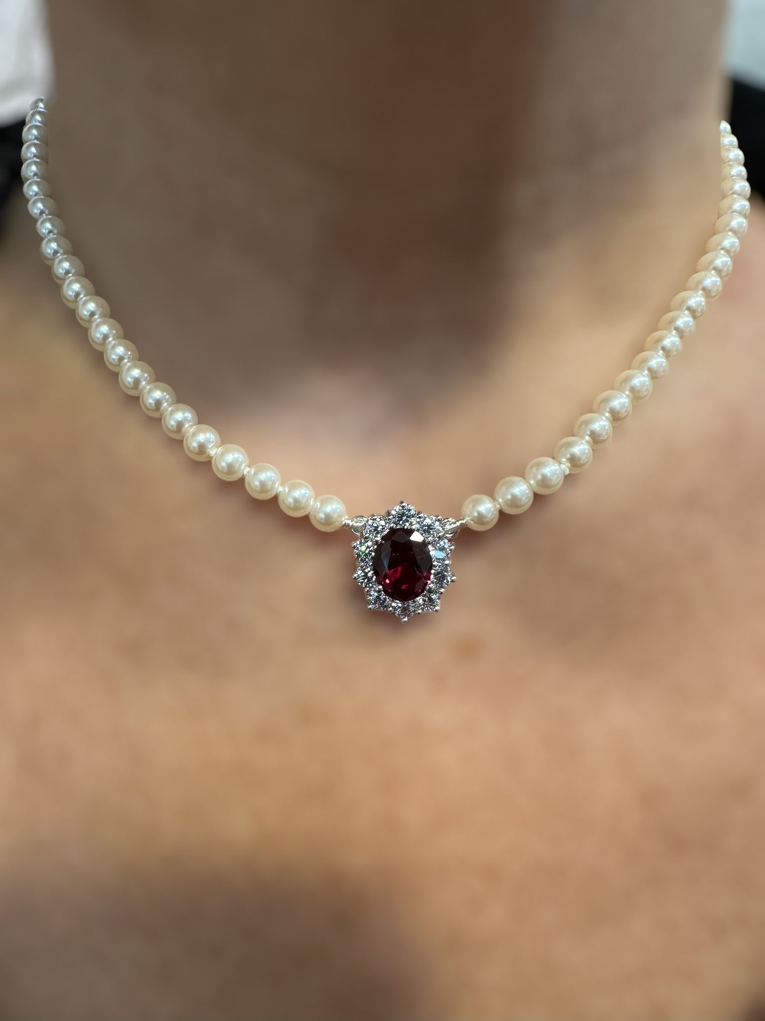 Collana donna in argento 925 con perle acqua dolce, centrale royal con zircone rosso ovale e contorno di zirconi bianchi.