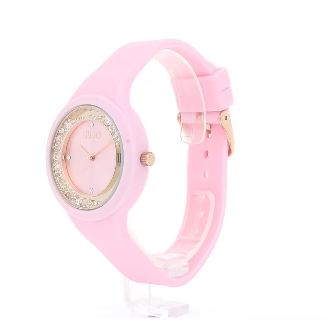 Orologio solo tempo da donna di liu jo della collezione dancing sport. Orologio con cassa in acciaio inossidabile e silicone del diametro di 38 mm e quadrante di colore pink. Cinturino in silicone di colore rosa. Vetro: minerale, pietre: esclusivi cristalli mobili sul castone. La resistenza all’acqua è di 5 atm e il movimento è seiko pc 21.