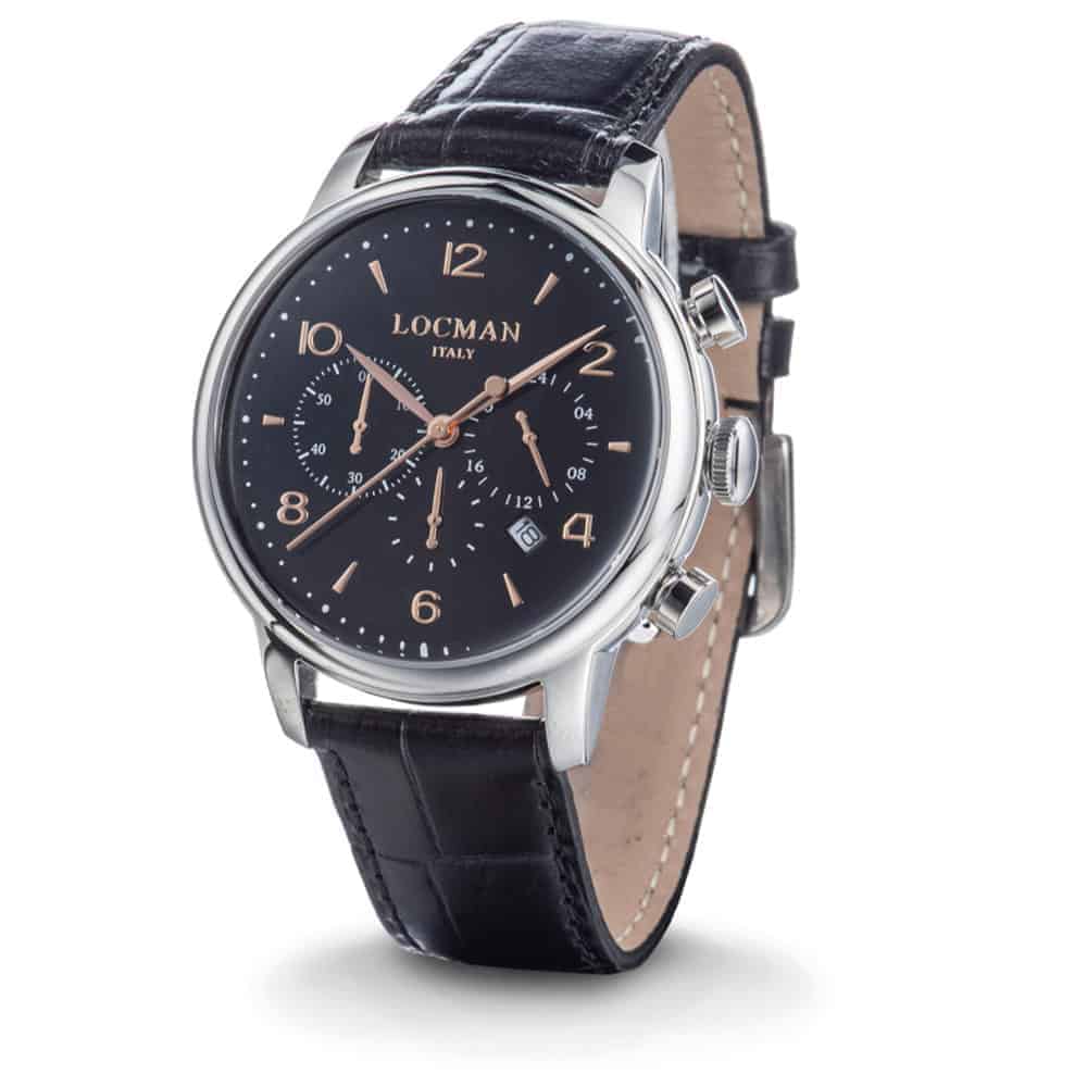 Cronografo uomo in acciaio della collezione 1960 con cinturino in pelle nera e indici applicati.