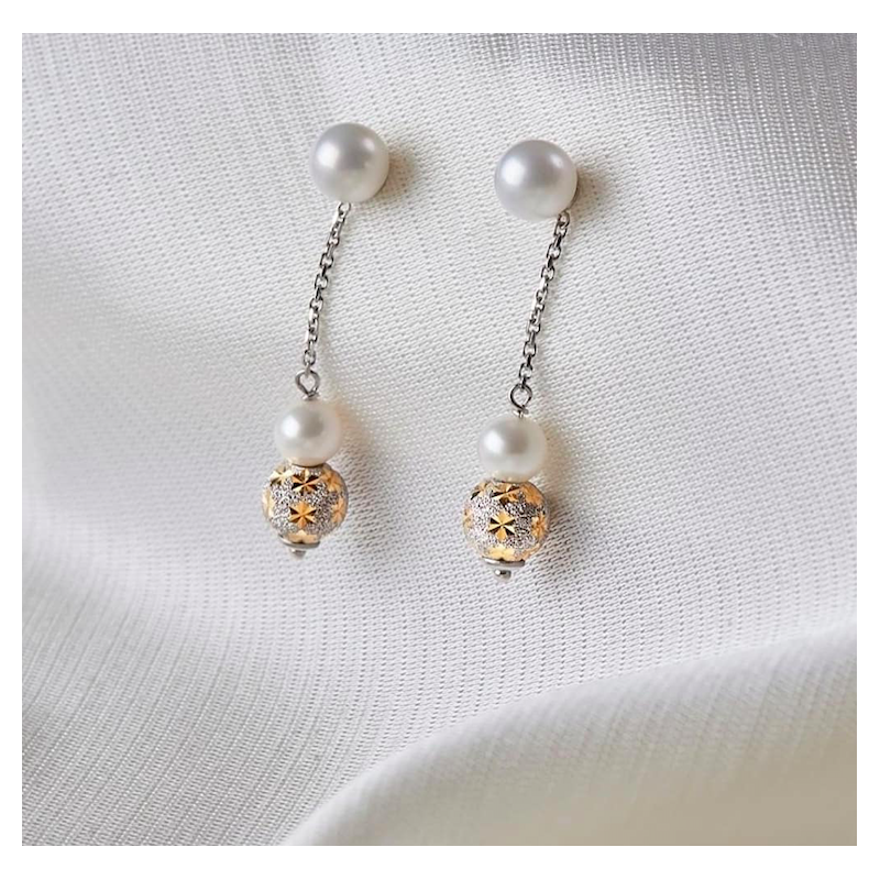 Orecchini pendenti in oro bianco 18kt con perle coltivate bianche e boule sfaccettate effetto diamantato rifinite in oro giallo 18kt.