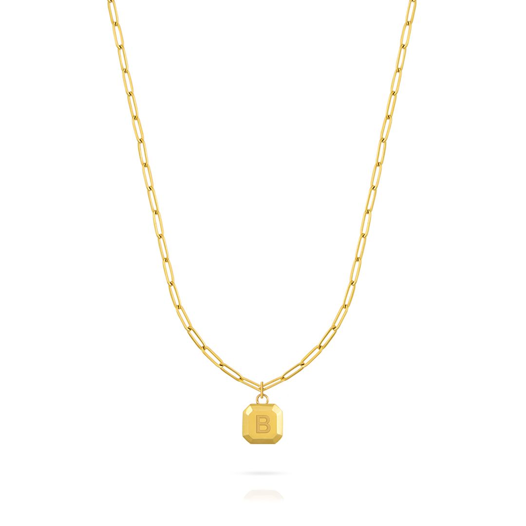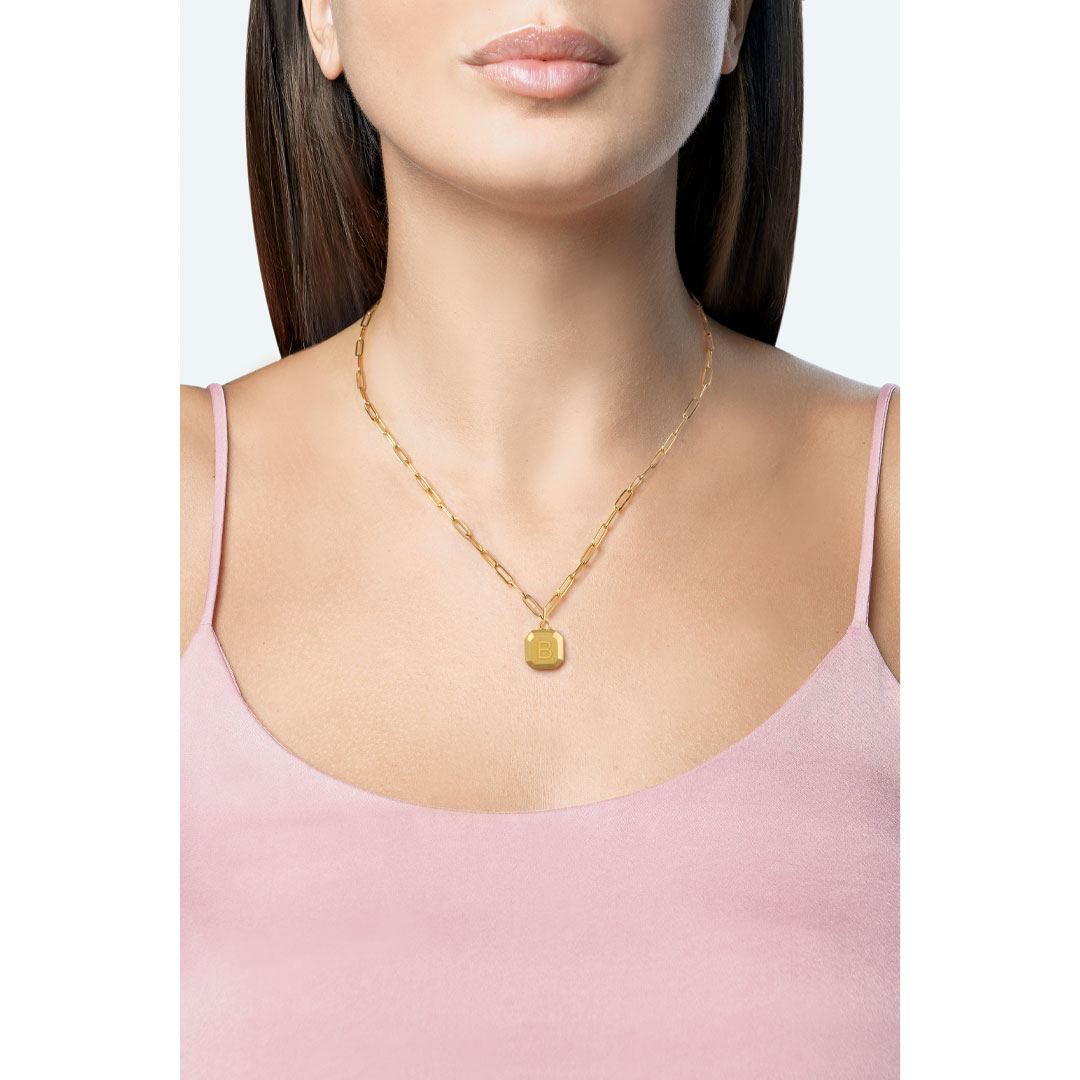 Collana in acciaio lucido con trattamento PVD oro giallo. Personalizzata con cuore OPS. Pendente sfaccettato con lettera incisa. Lunghezza 42 cm regolabile a 47 cm.