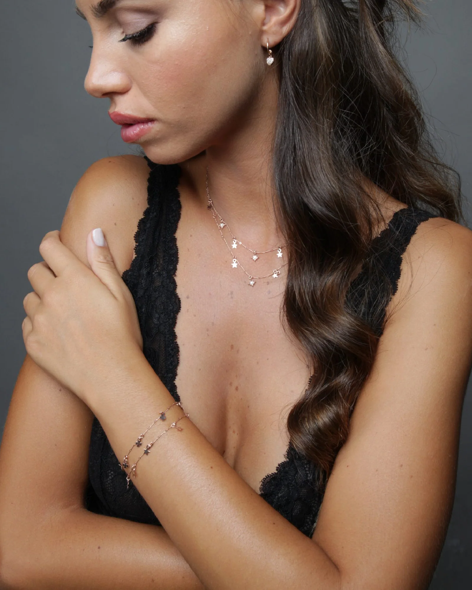 Bracciale con catenina ritorta e quadrifogli micro in argento 925 bagnato in oro rosa.
