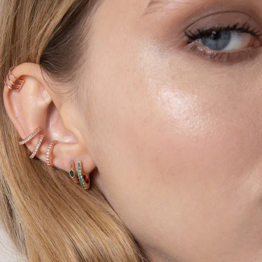 Ear cuff della collezione Piti Malì Earring Party da donna. Colore: oro rosa. L’orecchino da lobo esterno è in argento 925‰ placcato in oro rosa impreziosito da zirconi bianchi. Ear cuff indossato senza buco.