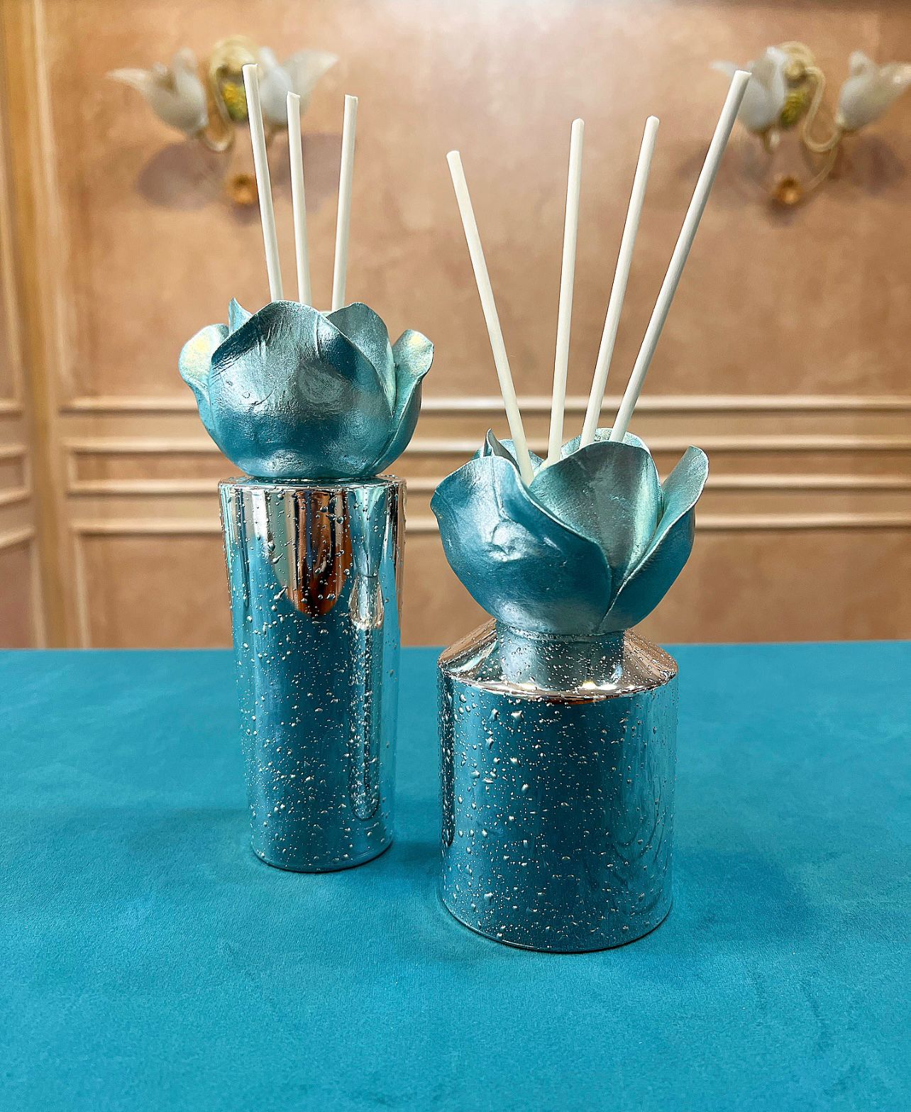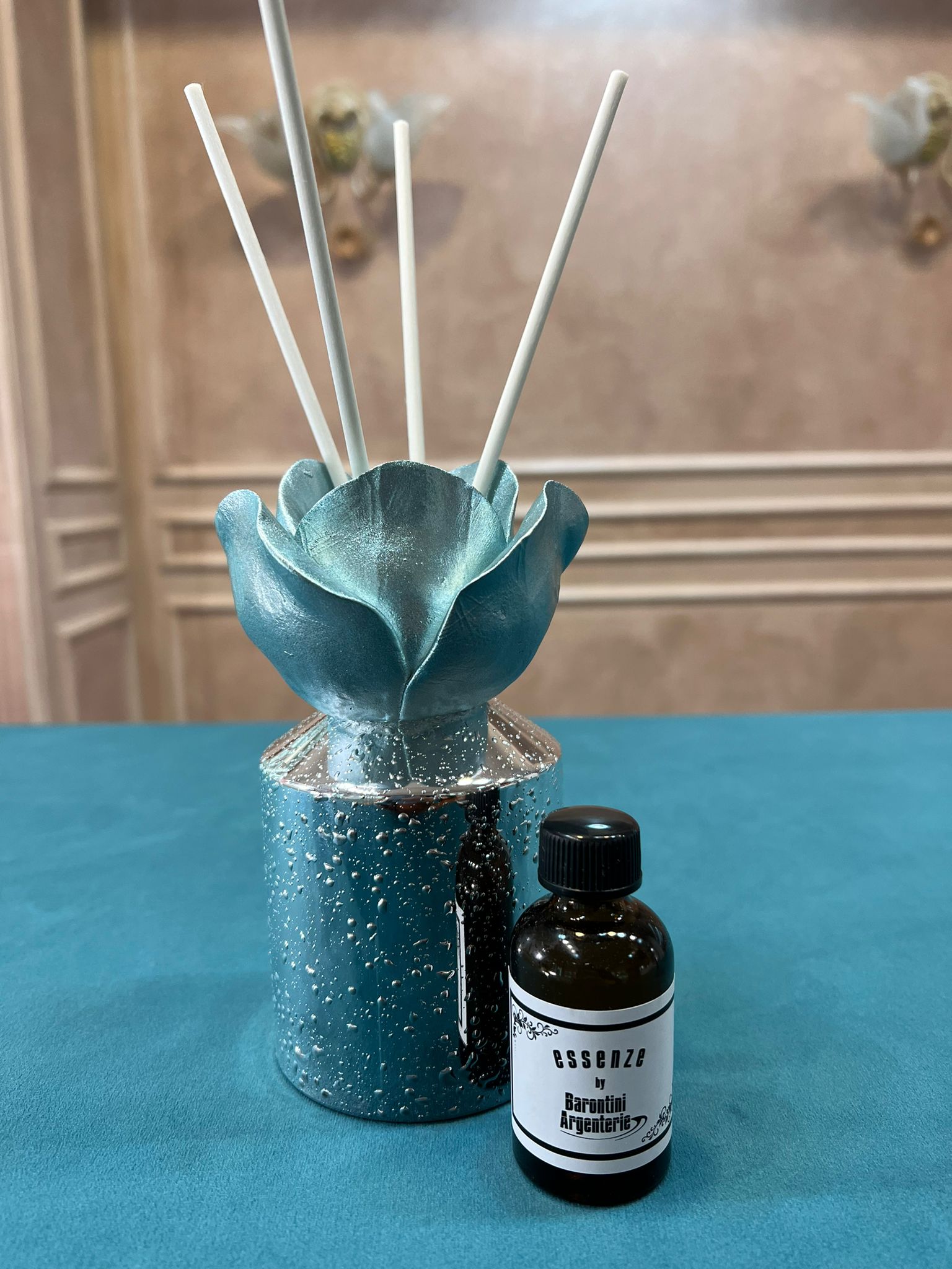 Elegante profumatore per ambiente in lamina d’argento con effetto teardrop, con rosa smaltata azzurra estraibile, bastoni per essenza ed essenza in dotazione.