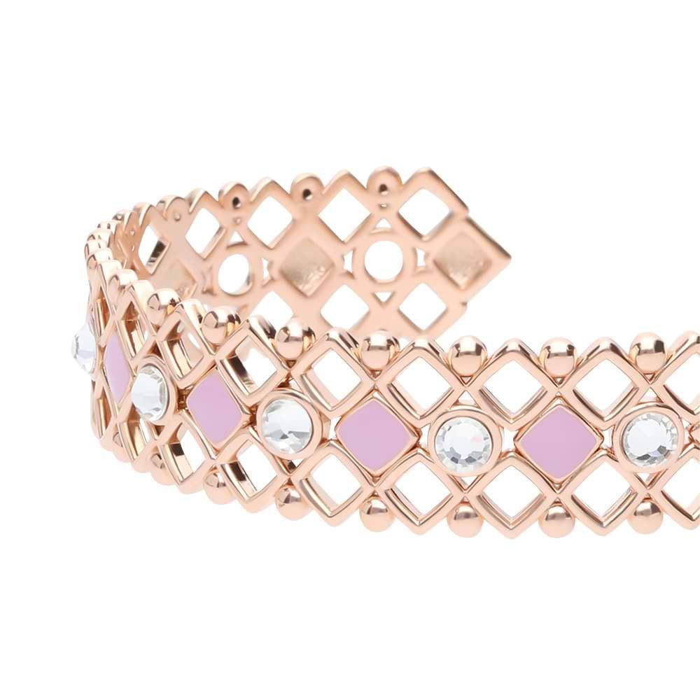 Bracciale rigido in ottone rosato con cristalli e smalto rosa spessore 1,4 cm.