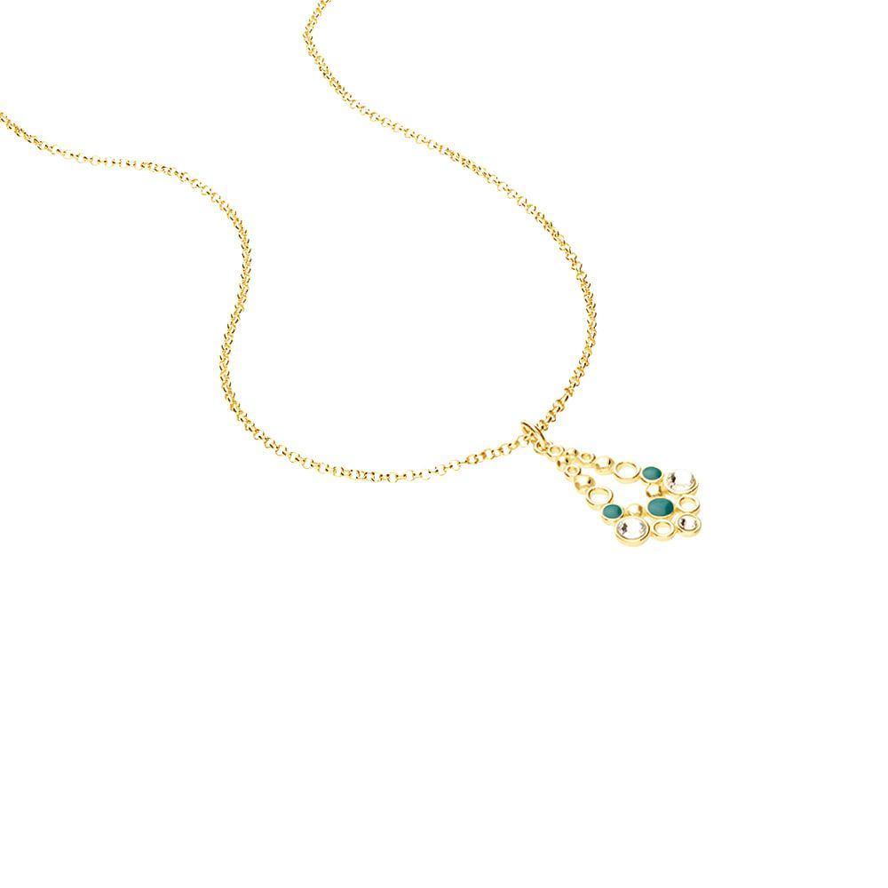 Collana in ottone dorato con ciondolo lancia cristalli e smalto verde.
