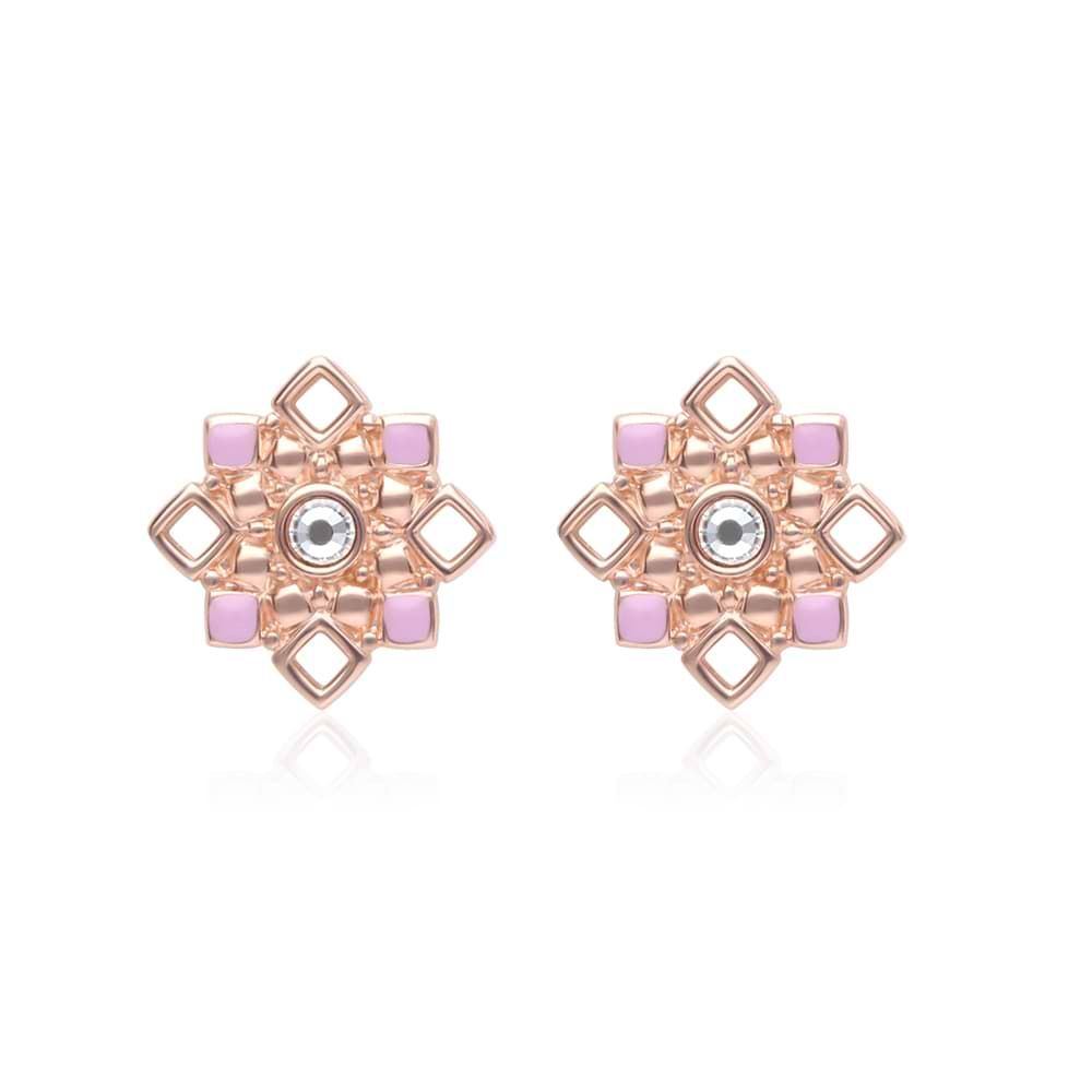 Orecchini a lobo in ottone rosato forma fiore con cristalli e smalto rosa.