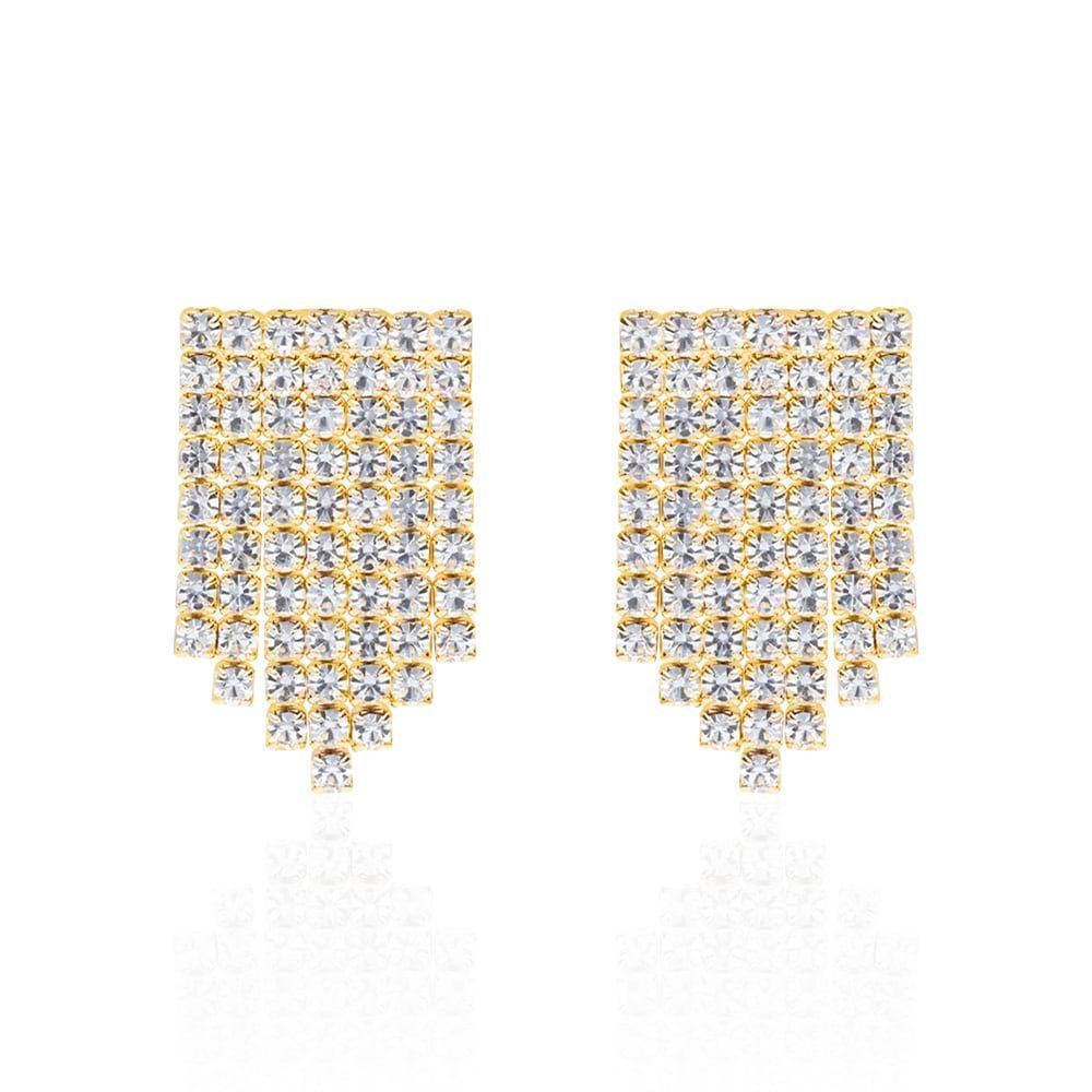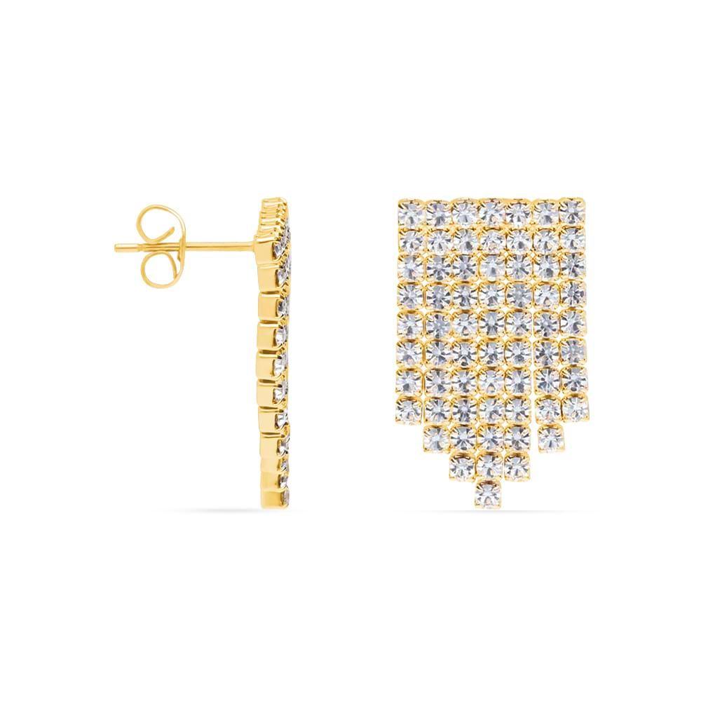 Orecchini pendenti multifilo in metallo dorato con strass.