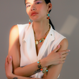 - Collana catena forzatina ovale dorata con charms monete e perle colorate corallo e turchese. Un gioiello dall'irresistibile mood Bohémien per un mix d'eleganza e fascino gitano che conquisterà la tua estate. Completa il look con bracciale ed orecchini coordinati e fai tintinnare il tuo stile!