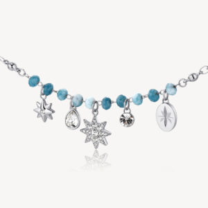 - Collana girocollo a doppio filo in acciaio 316L con pendente a forma di stella e cristallo colore aquamarine.