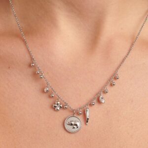 - VITA, FORTUNA, EVOLUZIONE Simbolo della vita in continua evoluzione che si moltiplica nel tempo e nello spazio, rappresenta l’augurio di un’esistenza costruita su solide basi e che sia piena ed intensa. Un portafortuna per iniziare una nuova avventura. Collana in acciaio 316L con pendenti a forma di albero della vita, cuore, infinito e cristalli.