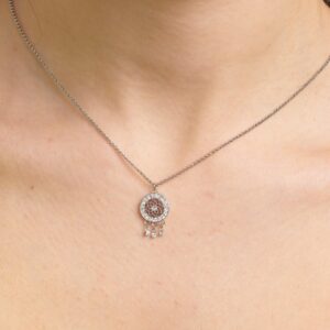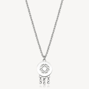 - SERENITÀ, PROTEZIONE, SPERANZA Oggetto capace di cullare la persona nei sogni positivi e proteggerla da quelli negativi. L’acchiappasogni fa in modo che i pensieri felici e le energie positive passino attraverso il proprio centro e arrivino fino alla mente durante il sonno. Collana girocollo in acciaio 316L con pendente a forma di acchiappasogni e cristalli.