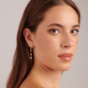 - Orecchini pendenti in bronzo con bagno in oro giallo 24 kt e perle bianche naturali. Chiusura con gancetto ad incastro. Gli orecchini presentano una catena forzatina sottile con due sfere in bronzo lucido posizionate alle due estremità ed una perla bianca naturale in fondo. Un accessorio dall'eleganza raffinata ed iper femminile.