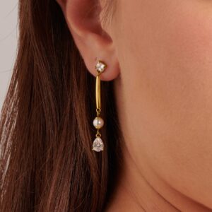 - Orecchini pendenti in acciaio 316L, finitura pvd oro 14K con perle di conchiglia e cubic zirconia.