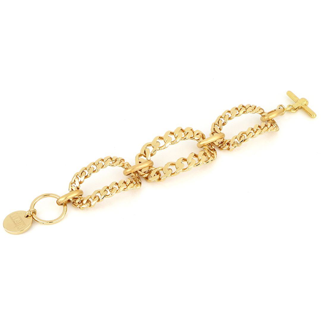 Bracciale in bronzo dorato lucido lungo 18 cm con tre maglie grandi costituite da catena grumetta battuta e chiusura a T-bar.